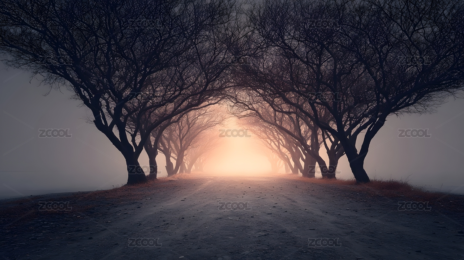 雾中树道尽头的光亮