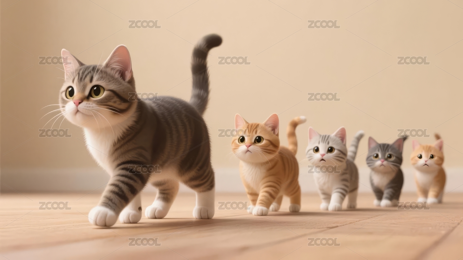 猫妈妈与四只小猫在木地板上行走