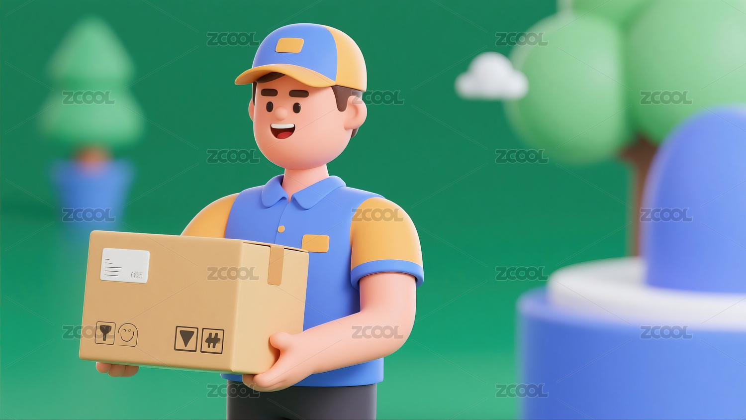 3D立体戴鸭舌帽快递员工作场景设计插画