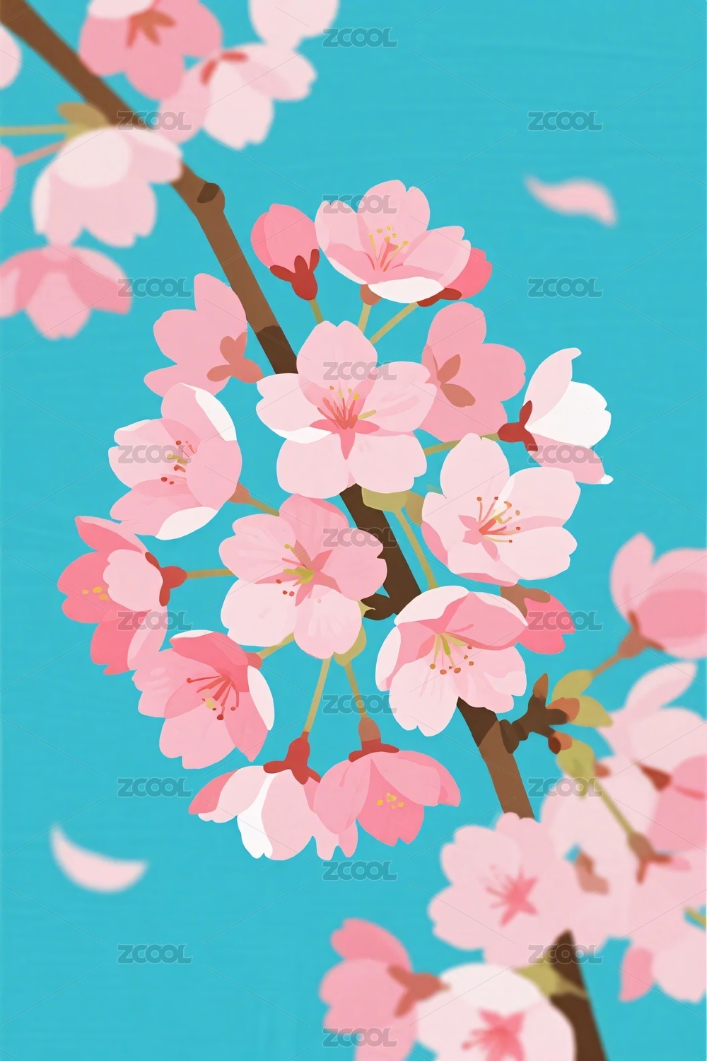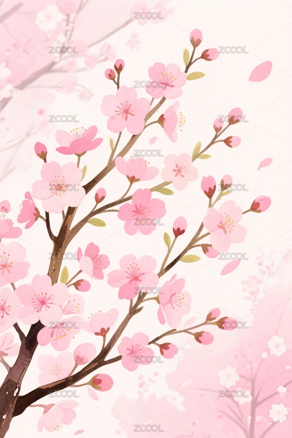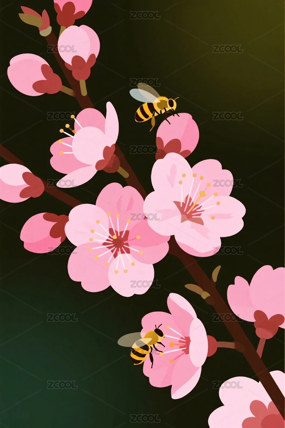 樱花,蜜蜂,树枝,花朵,花瓣,春日,插画,自然,装饰,植物