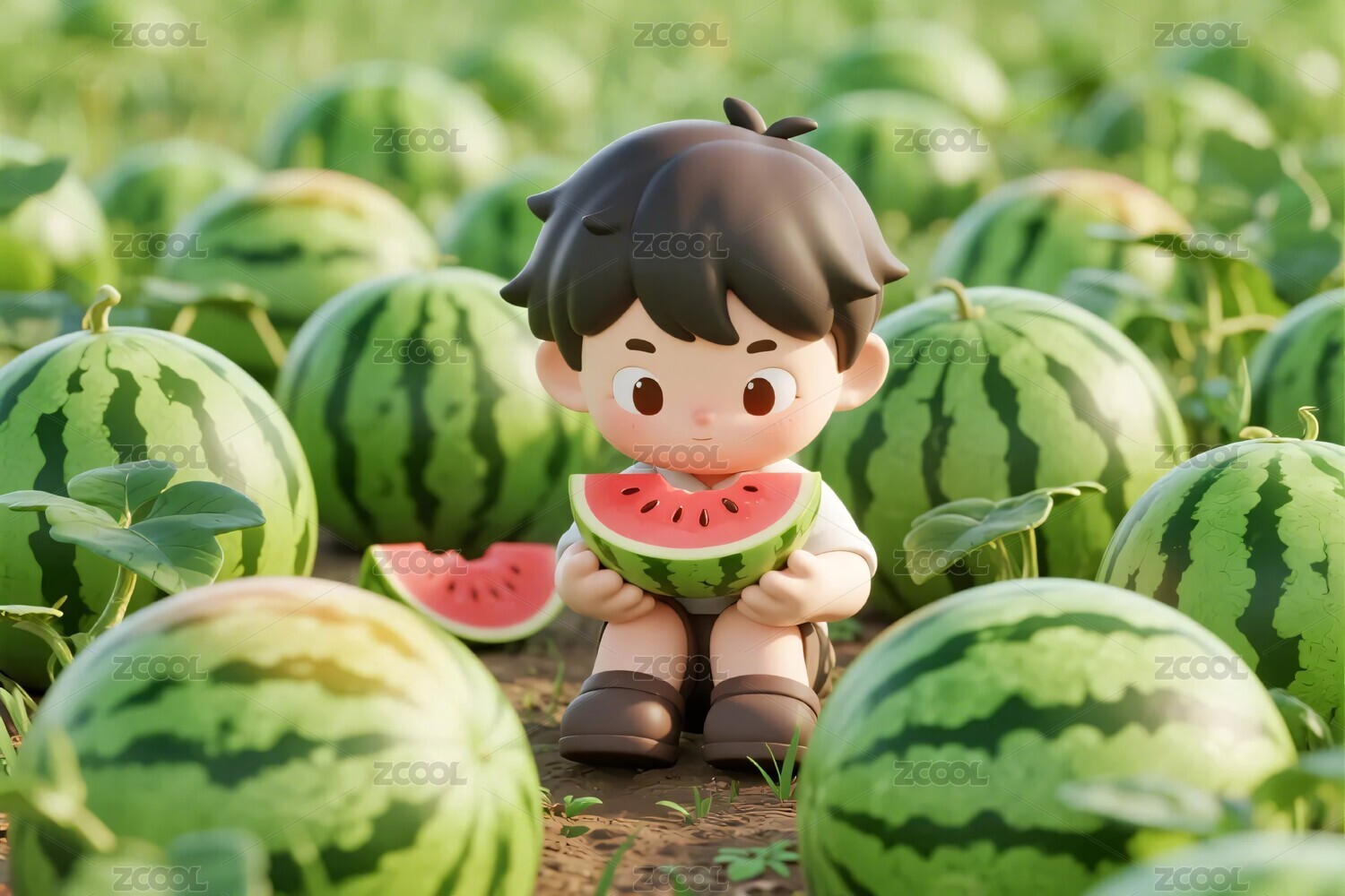 卡通小孩西瓜田园场景