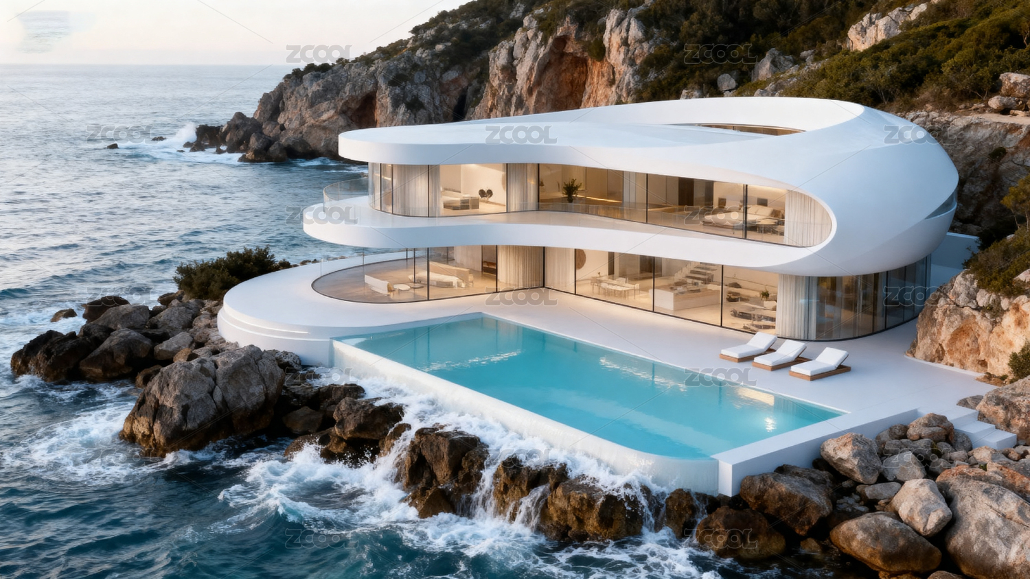 现代海滨别墅与无边际泳池