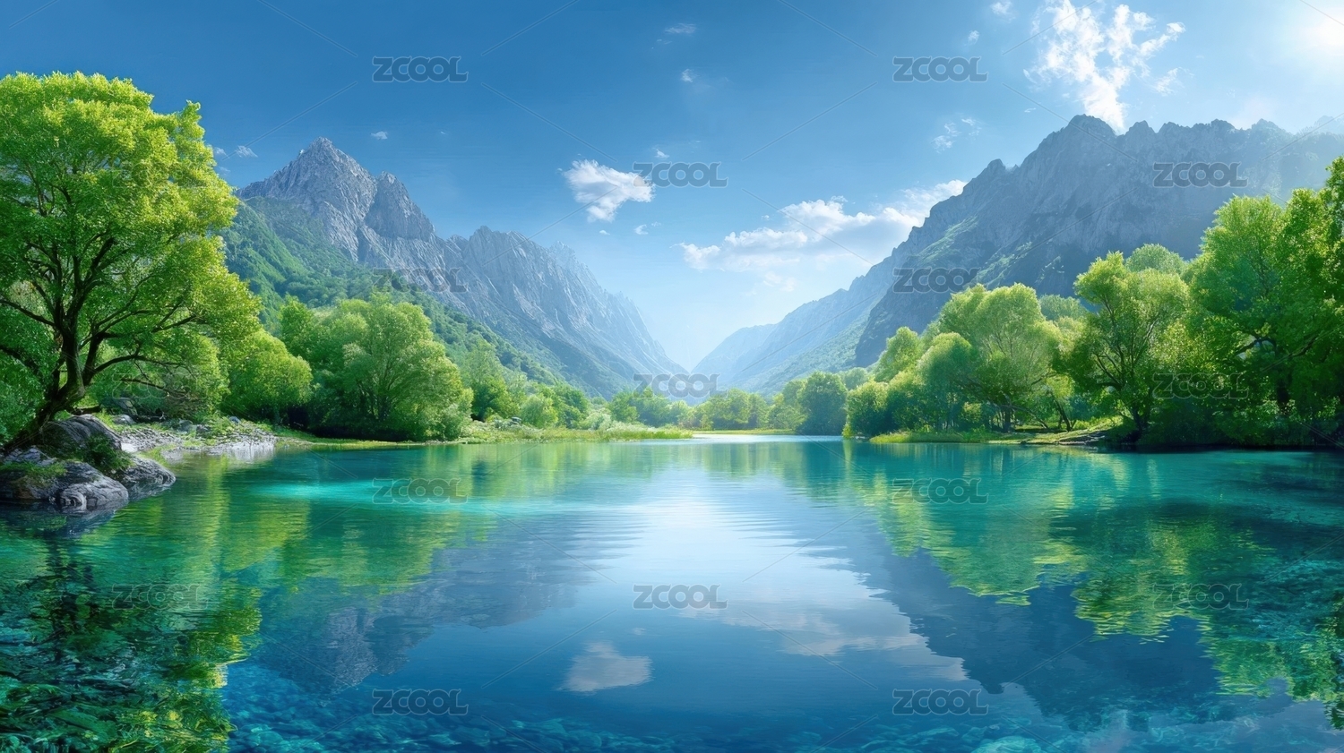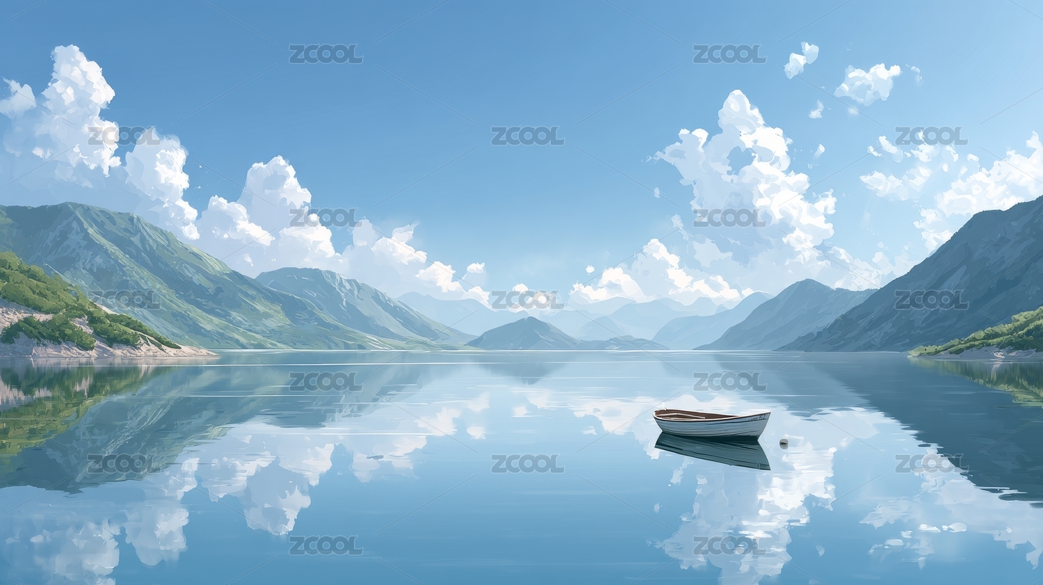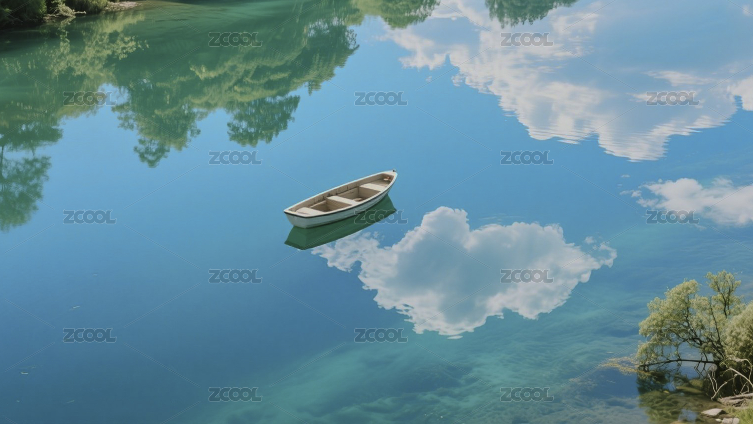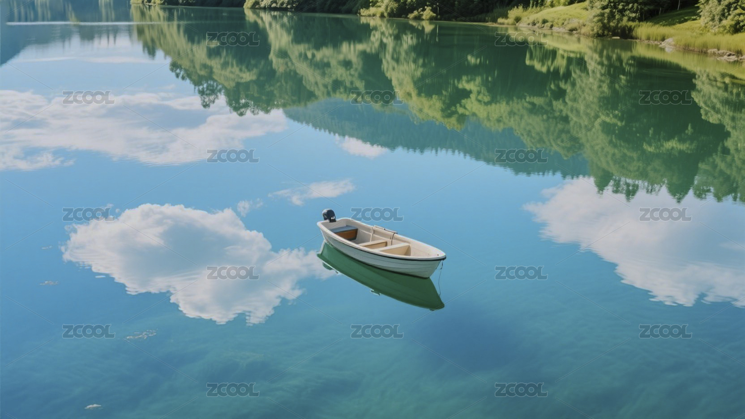 湖泊,小船,倒影,天空,白云,宁静,水面,自然风光,湖光山色,平静