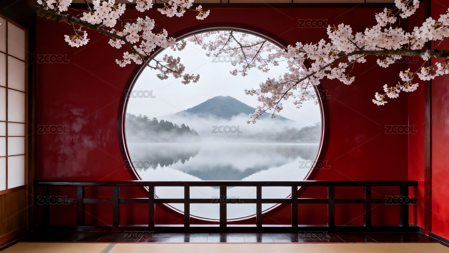 红色室内圆形窗景山雾樱花