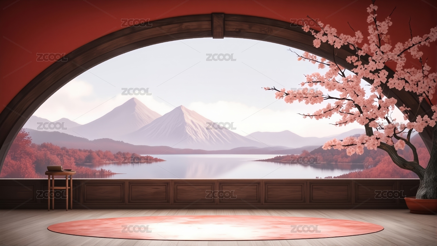 红色日式房间窗外樱花山景