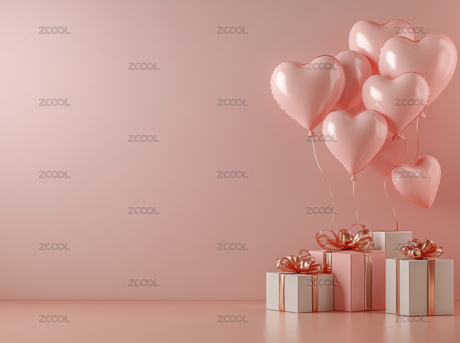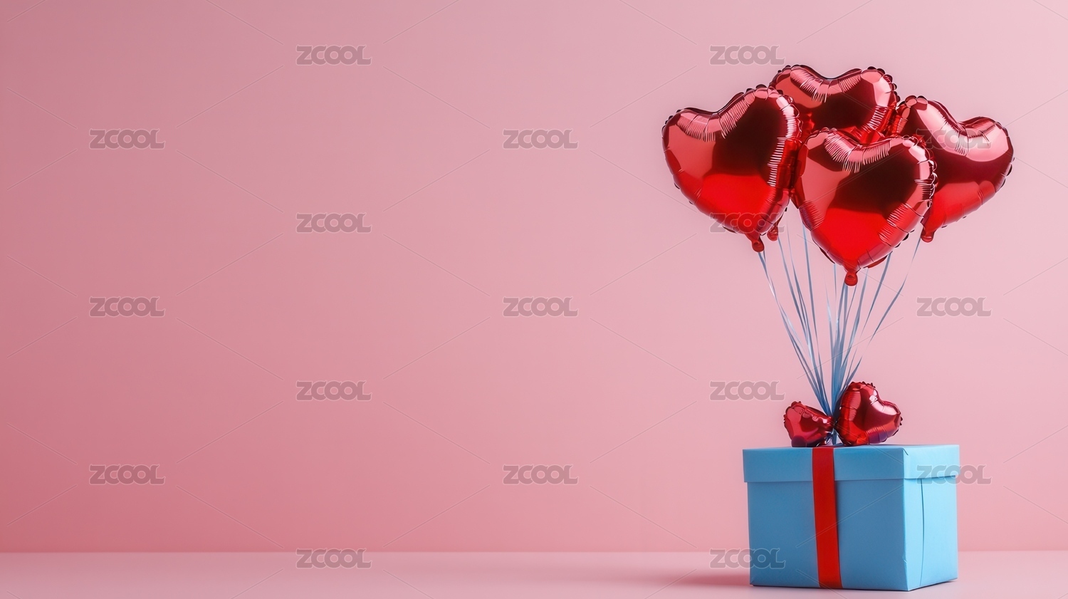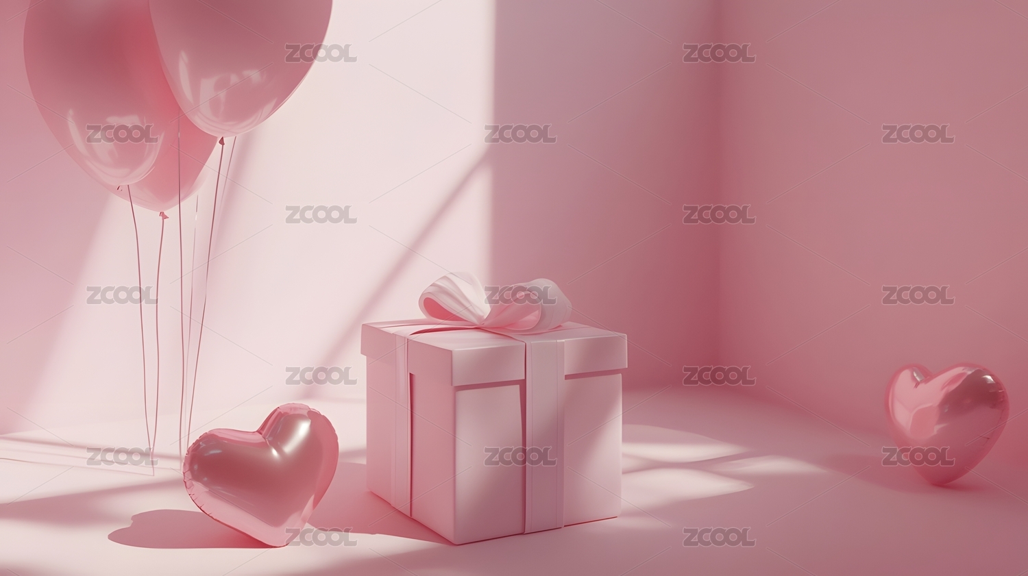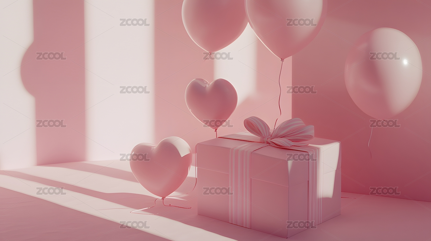 粉红背景下礼盒和红心气球