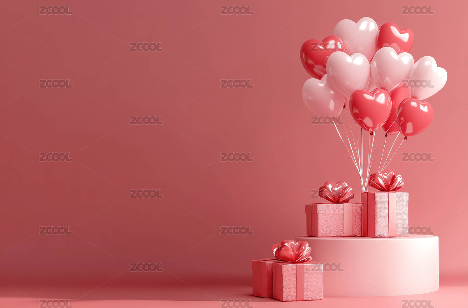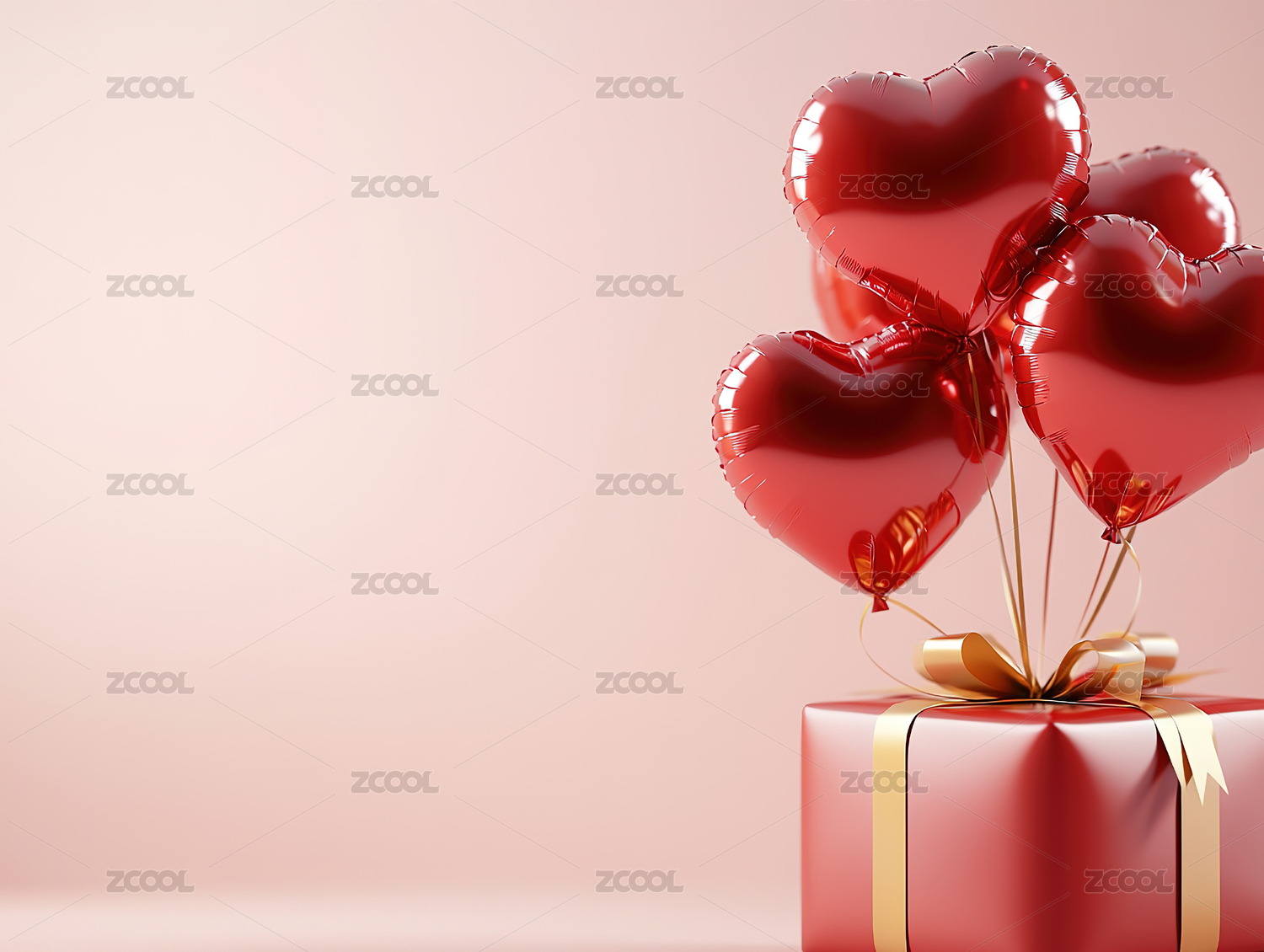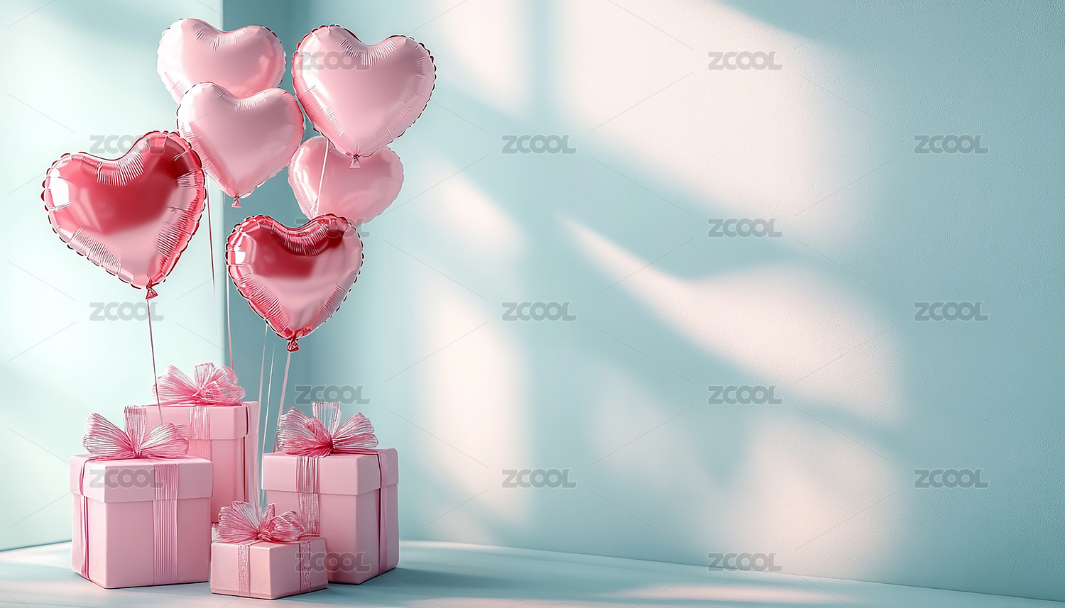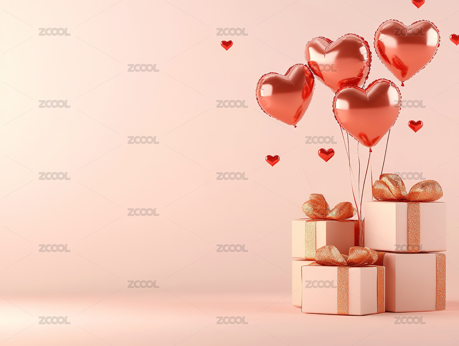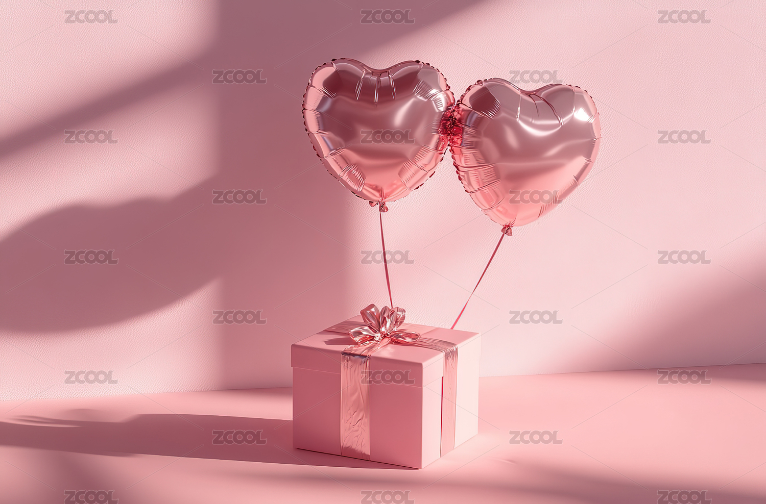 粉红背景下礼盒和红心气球