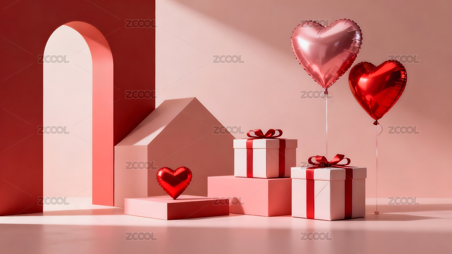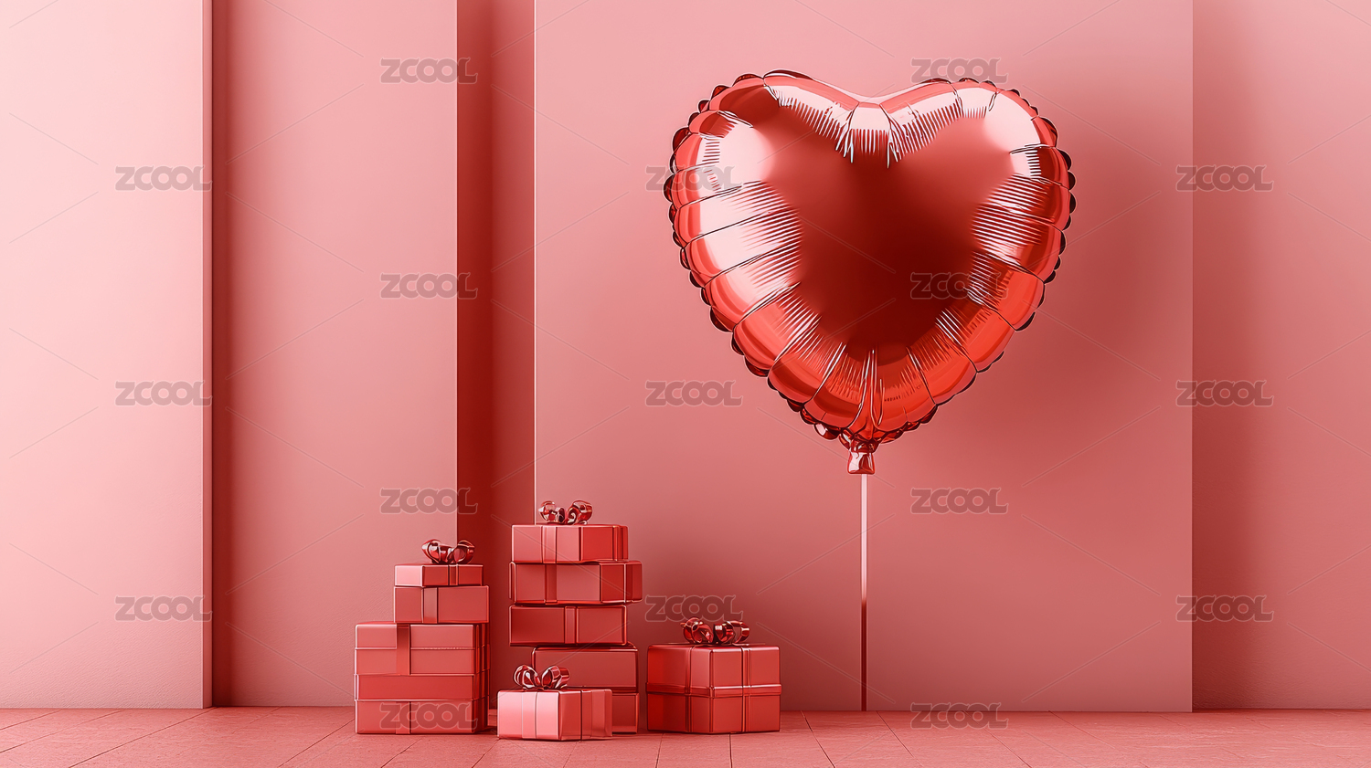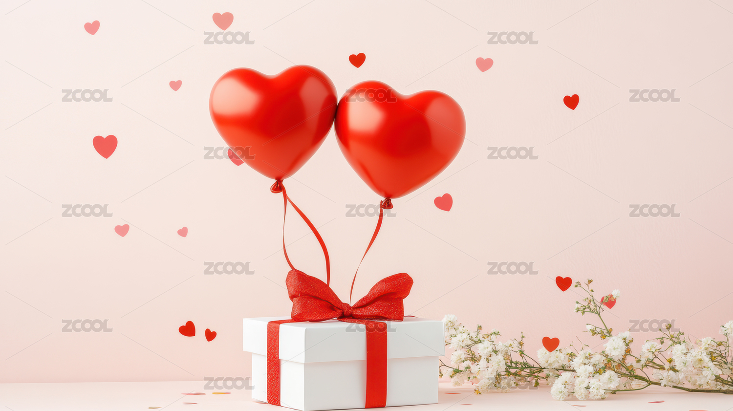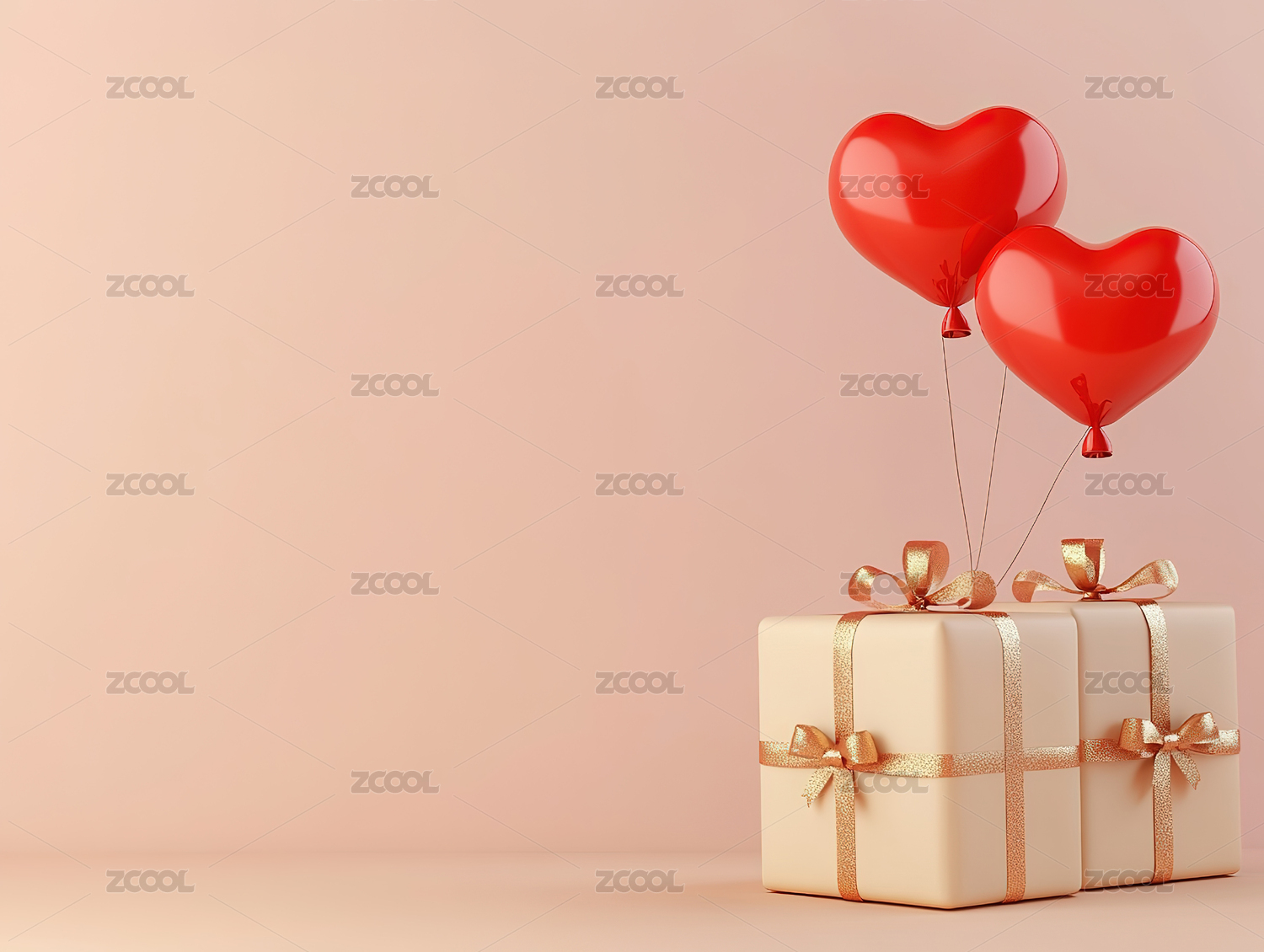 粉红背景下礼盒和红心气球