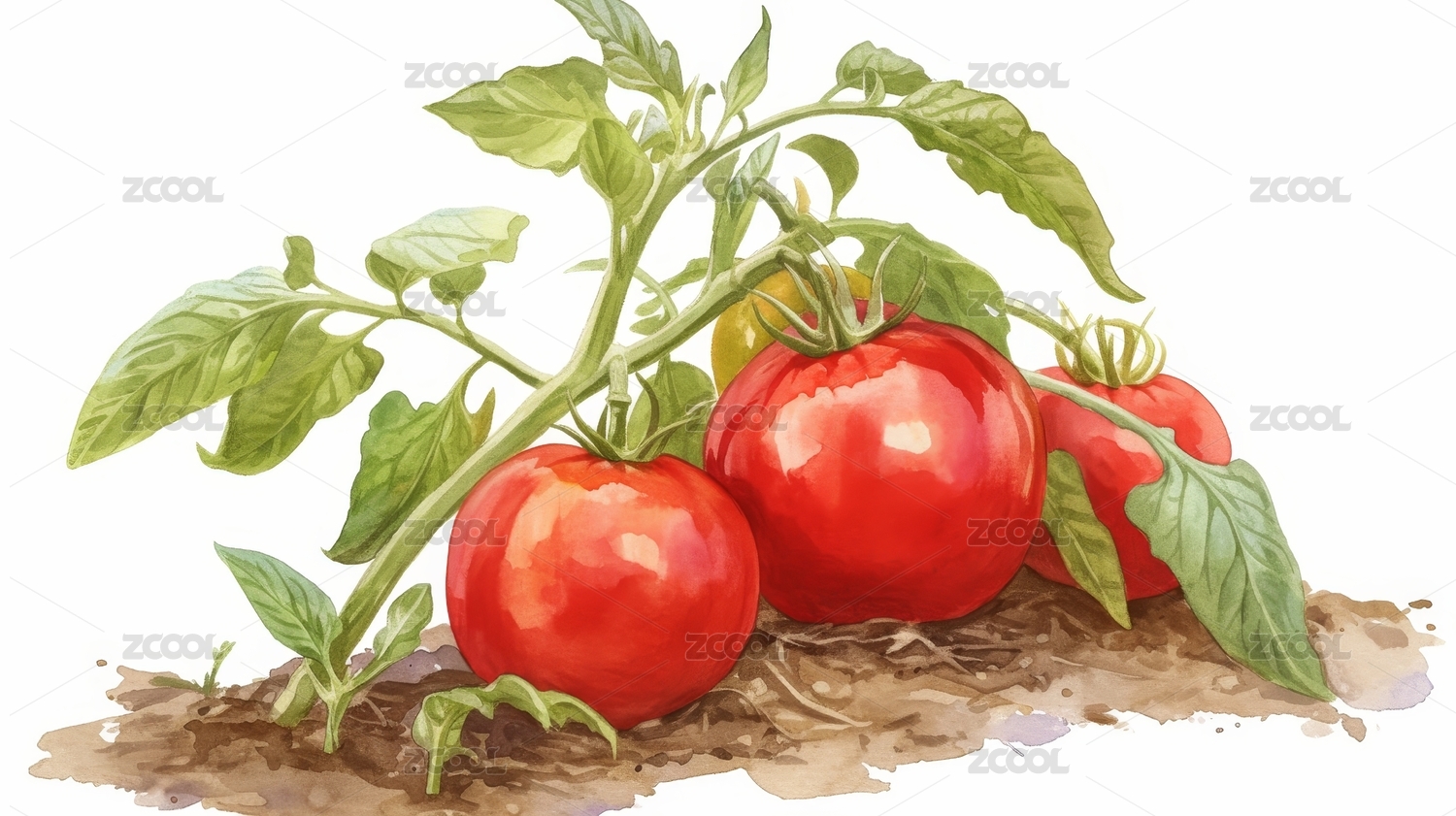 新鲜番茄与绿叶的水彩画
