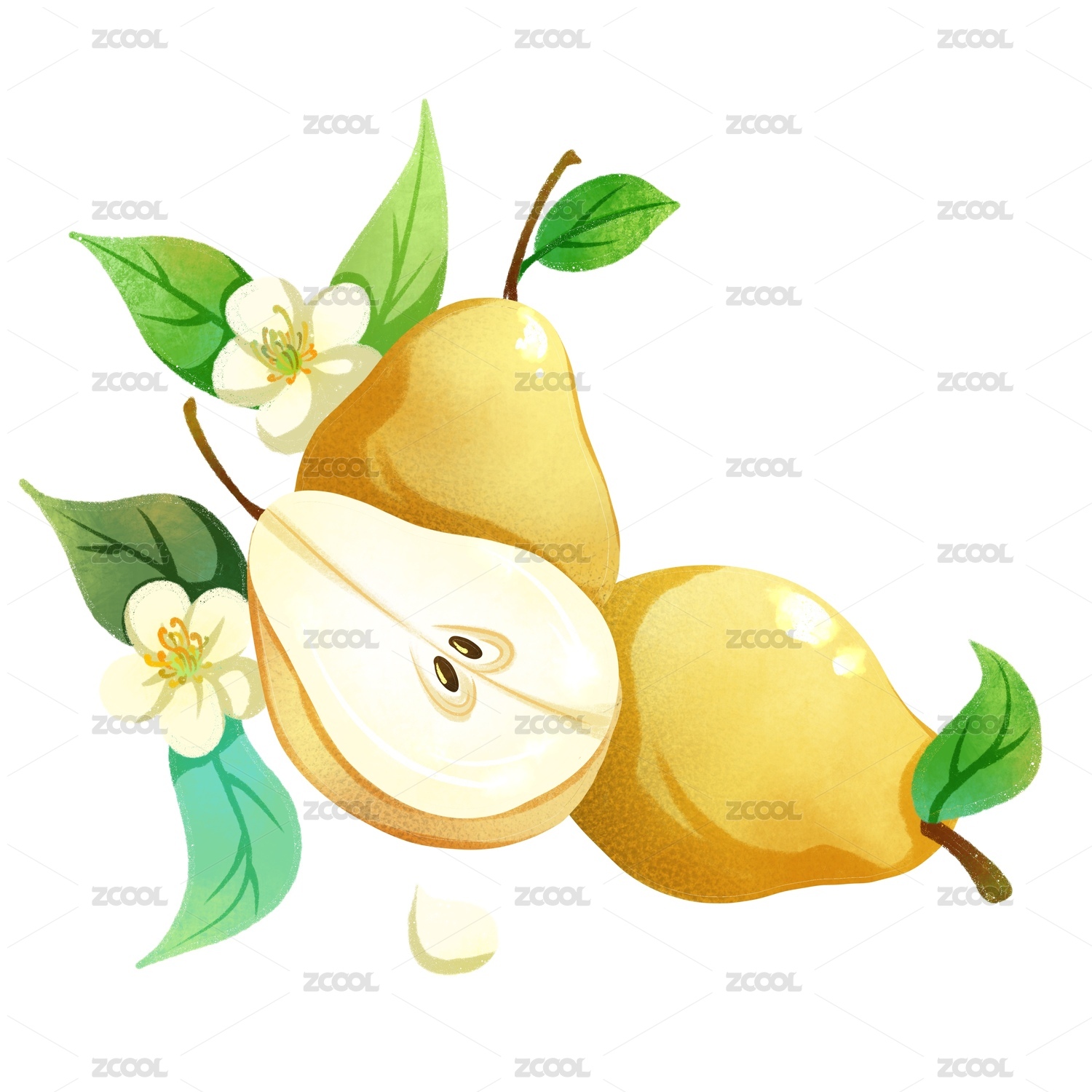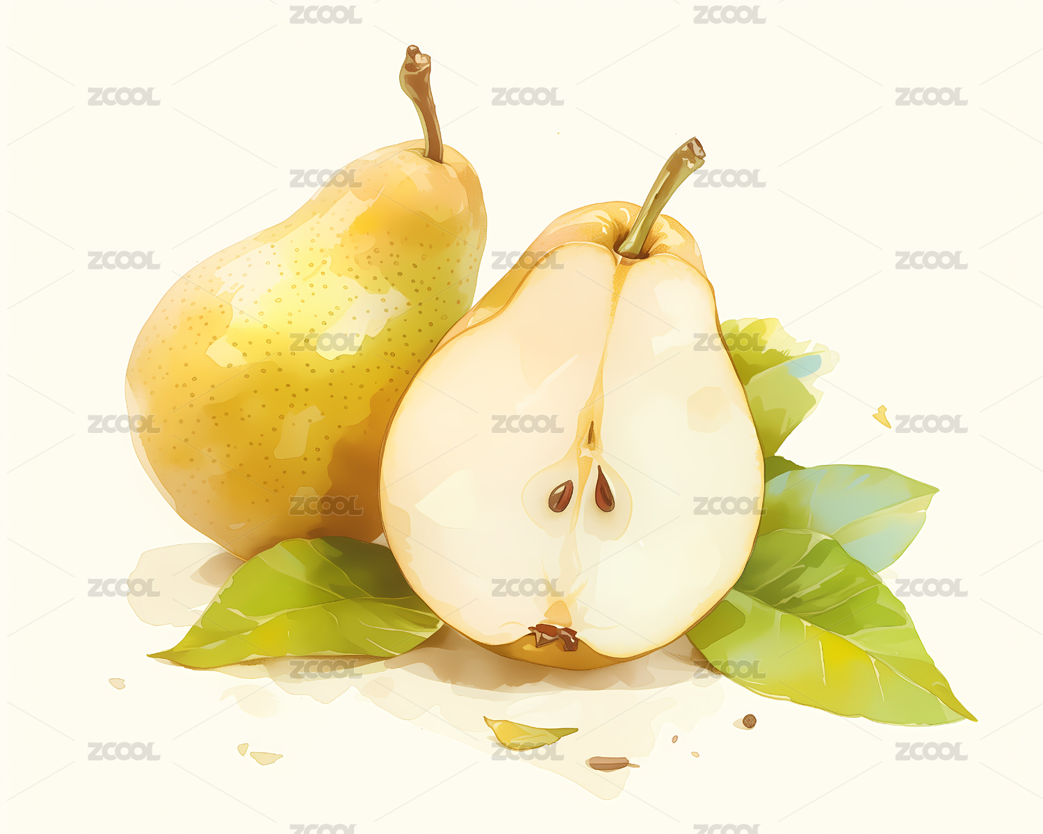 梨子整齐摆放在盘子上,叶子点缀,色彩鲜艳