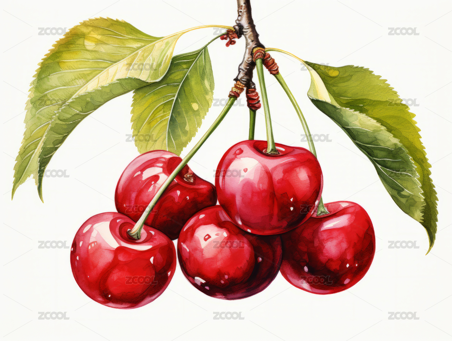 枝头红樱桃晶莹欲滴 水彩写实风
