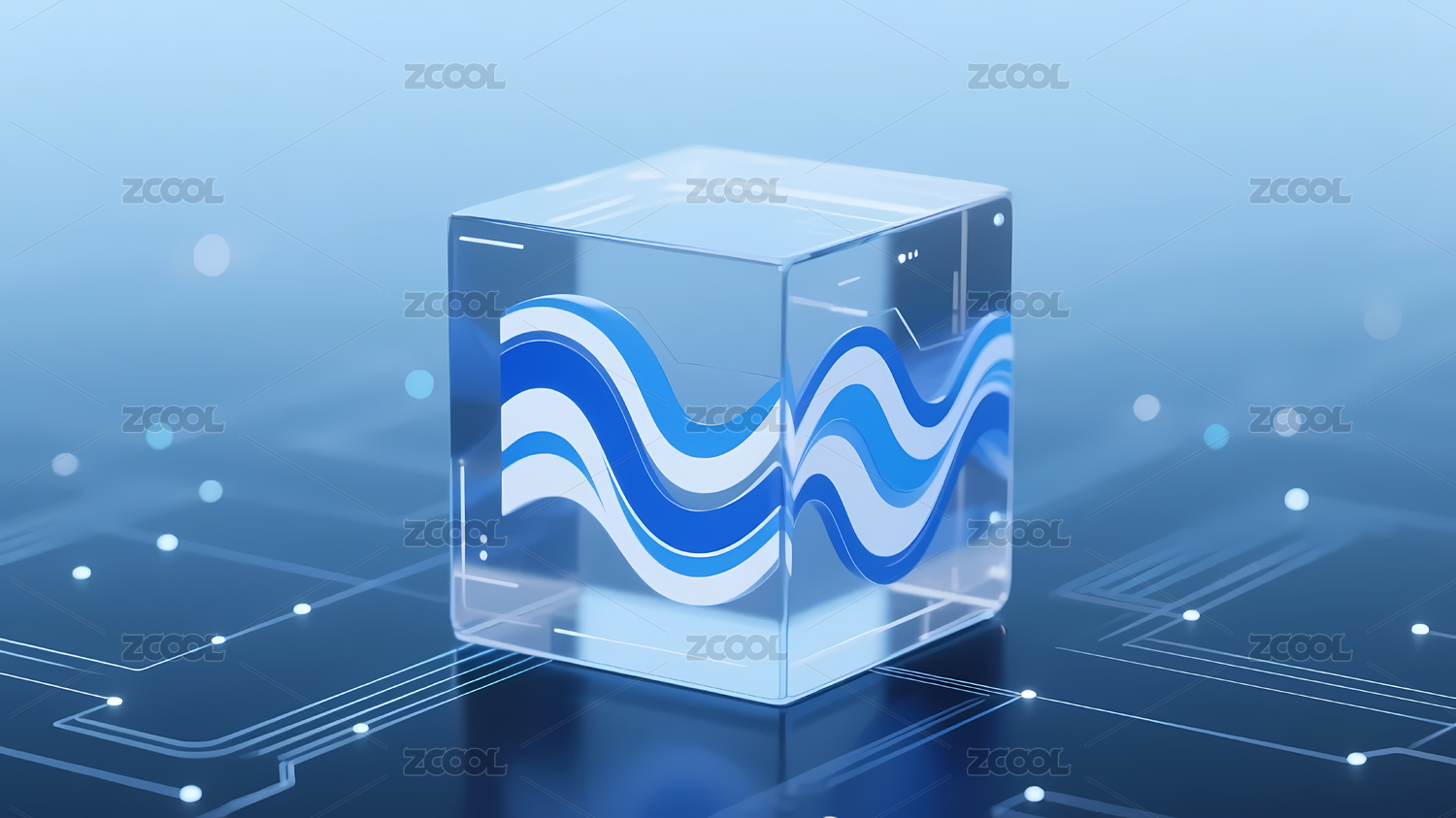 透明立方体与蓝色波浪线