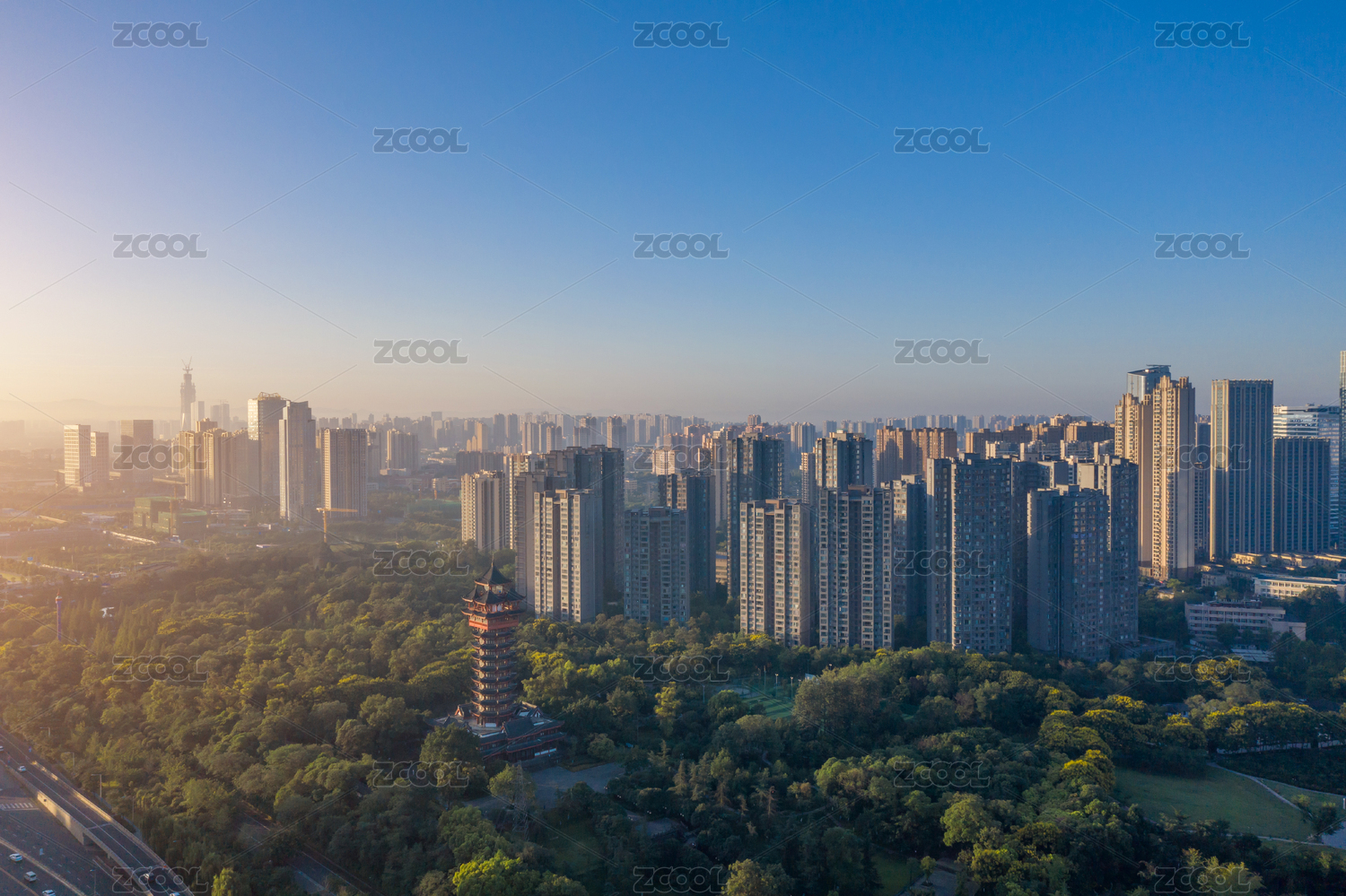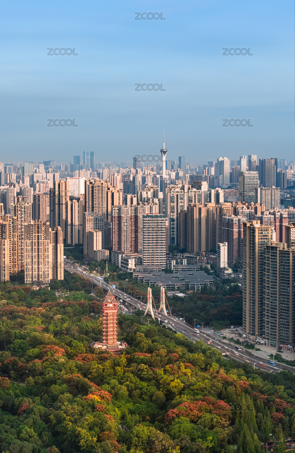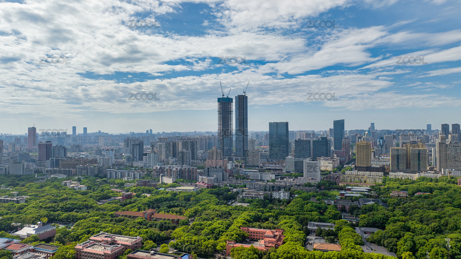 夏季白天武汉市摩天大楼和解放公园步月塔风