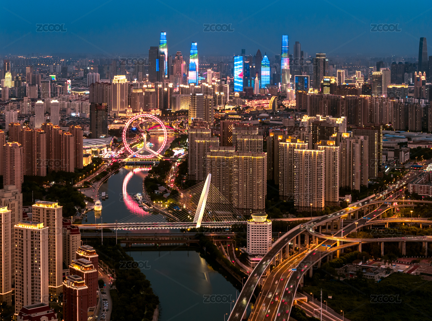 中国天津市天津之眼摩天轮和市区建筑夜景航拍图