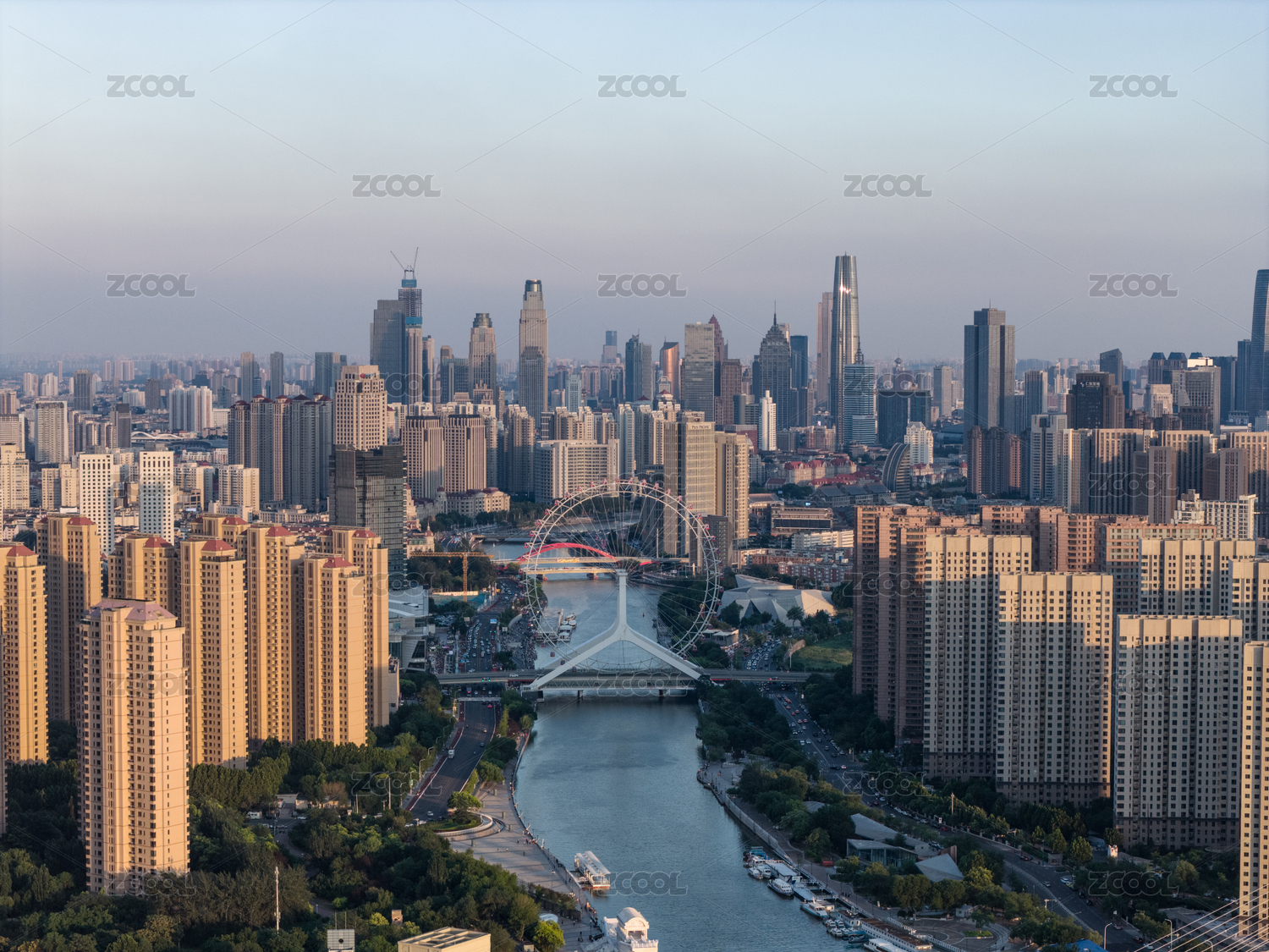 中国天津市天津之眼摩天轮天际线夜景航拍图