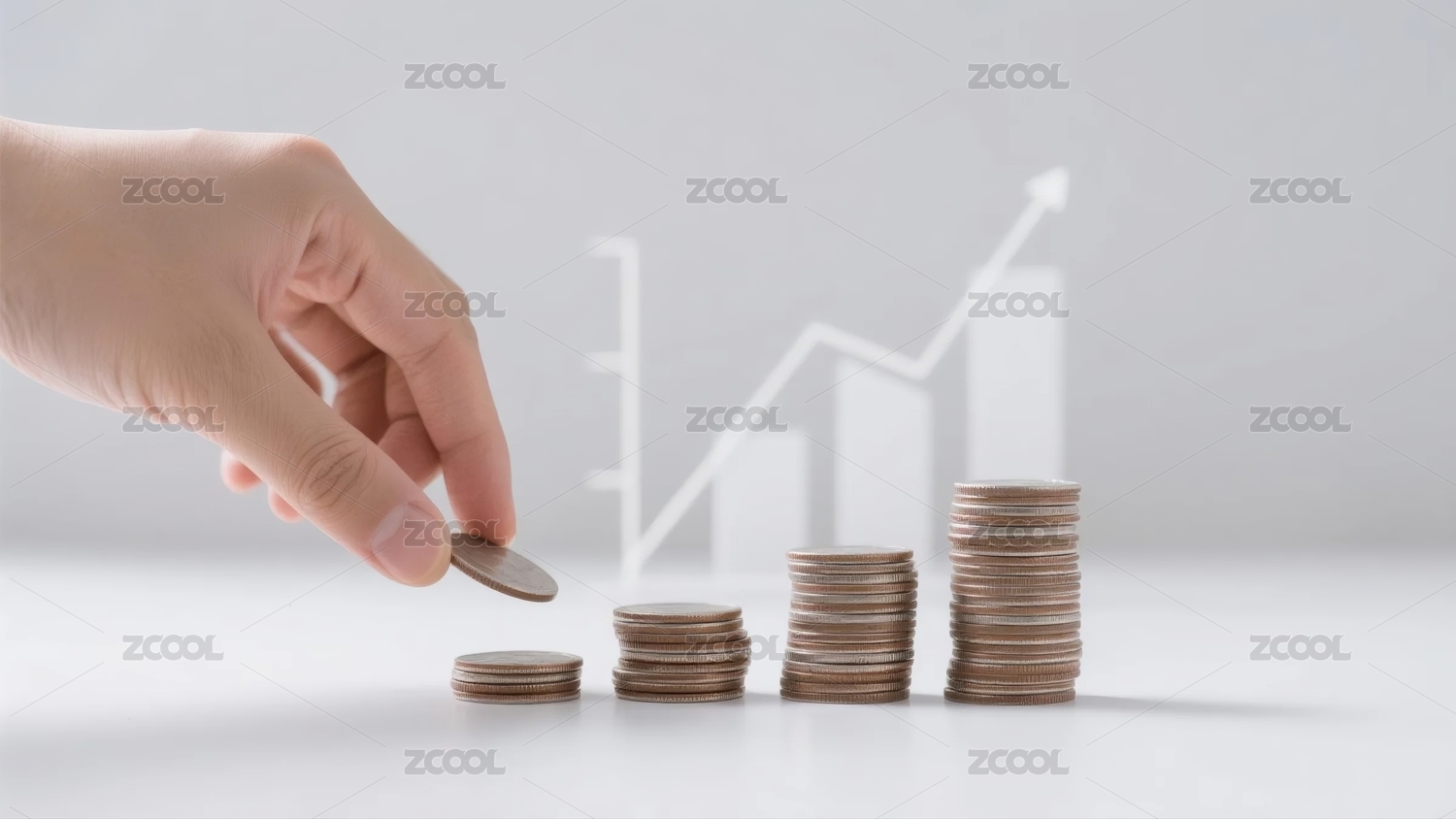 一只手正在往一排递增的美元硬币上继续码放硬币