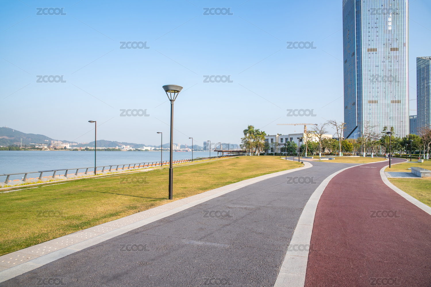 福建厦门杏林湾湖畔的红色步道与现代建筑群