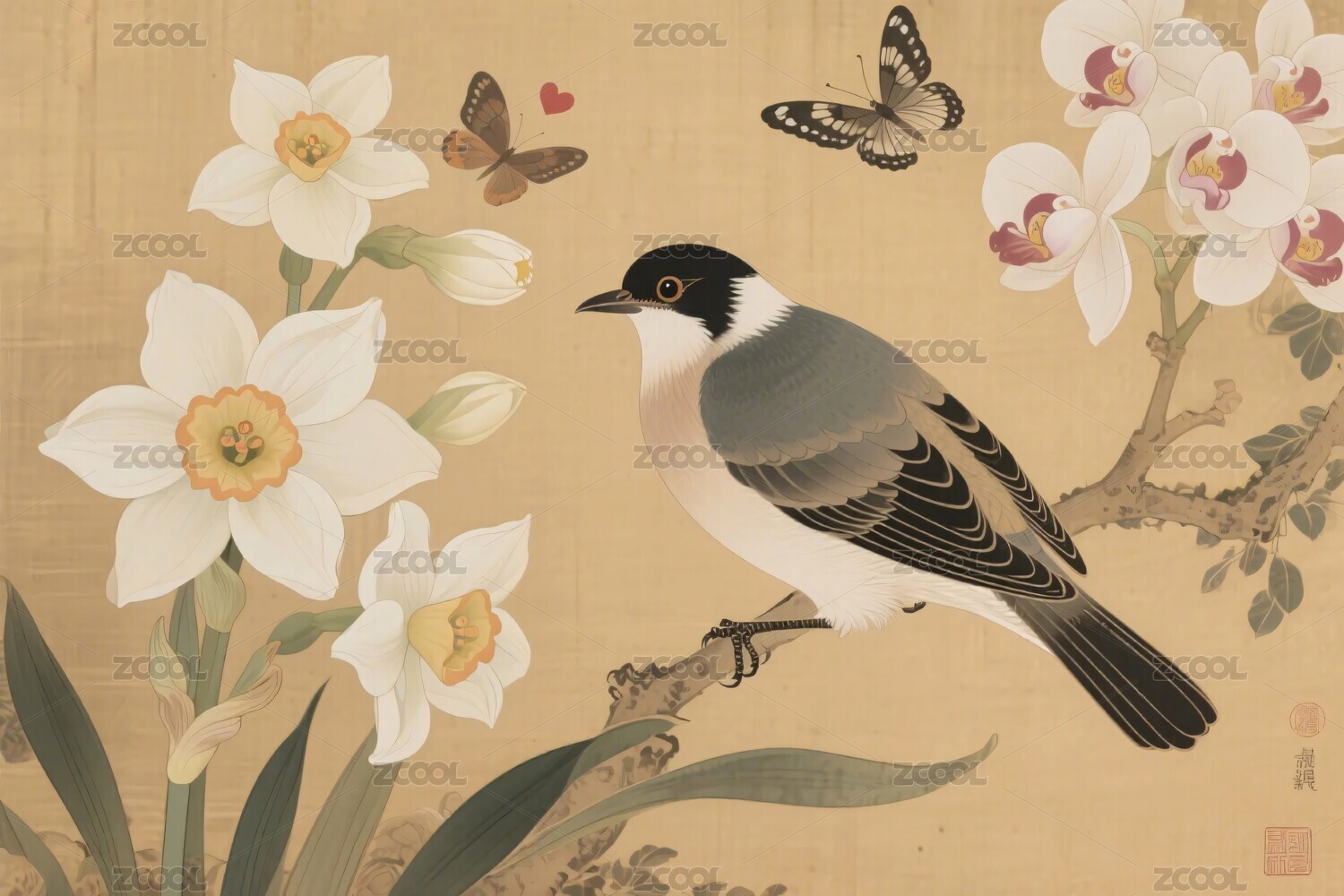 花卉,艺术,自然,中国风,雪山,国画,水墨画,鸟,喜鹊,花鸟画