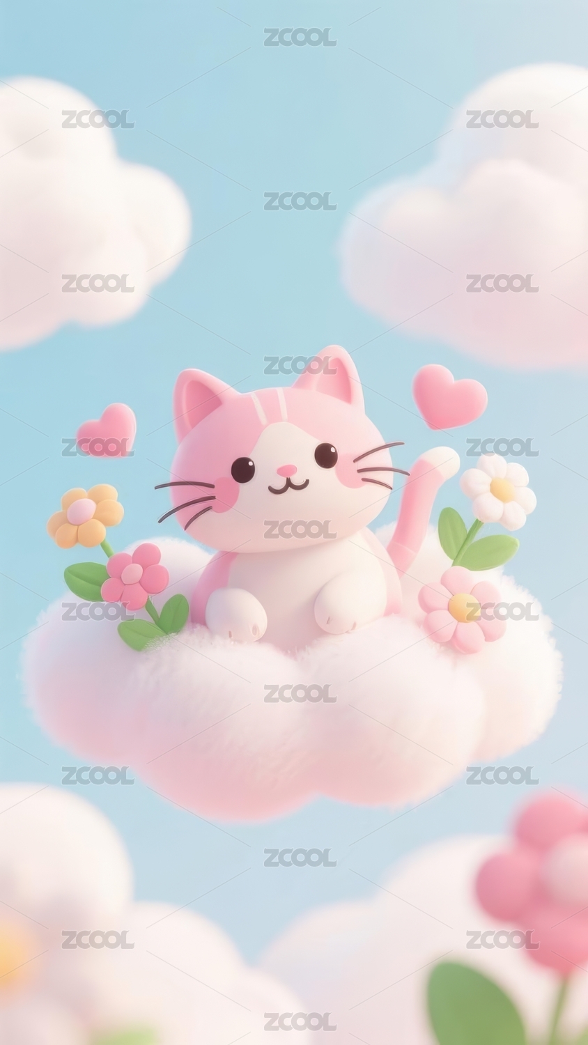 猫咪,云朵,蓝天,草地,小花,圆环,可爱,梦幻,插画,软萌