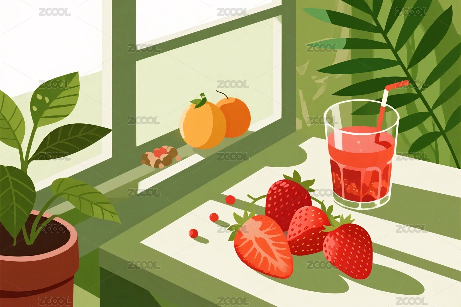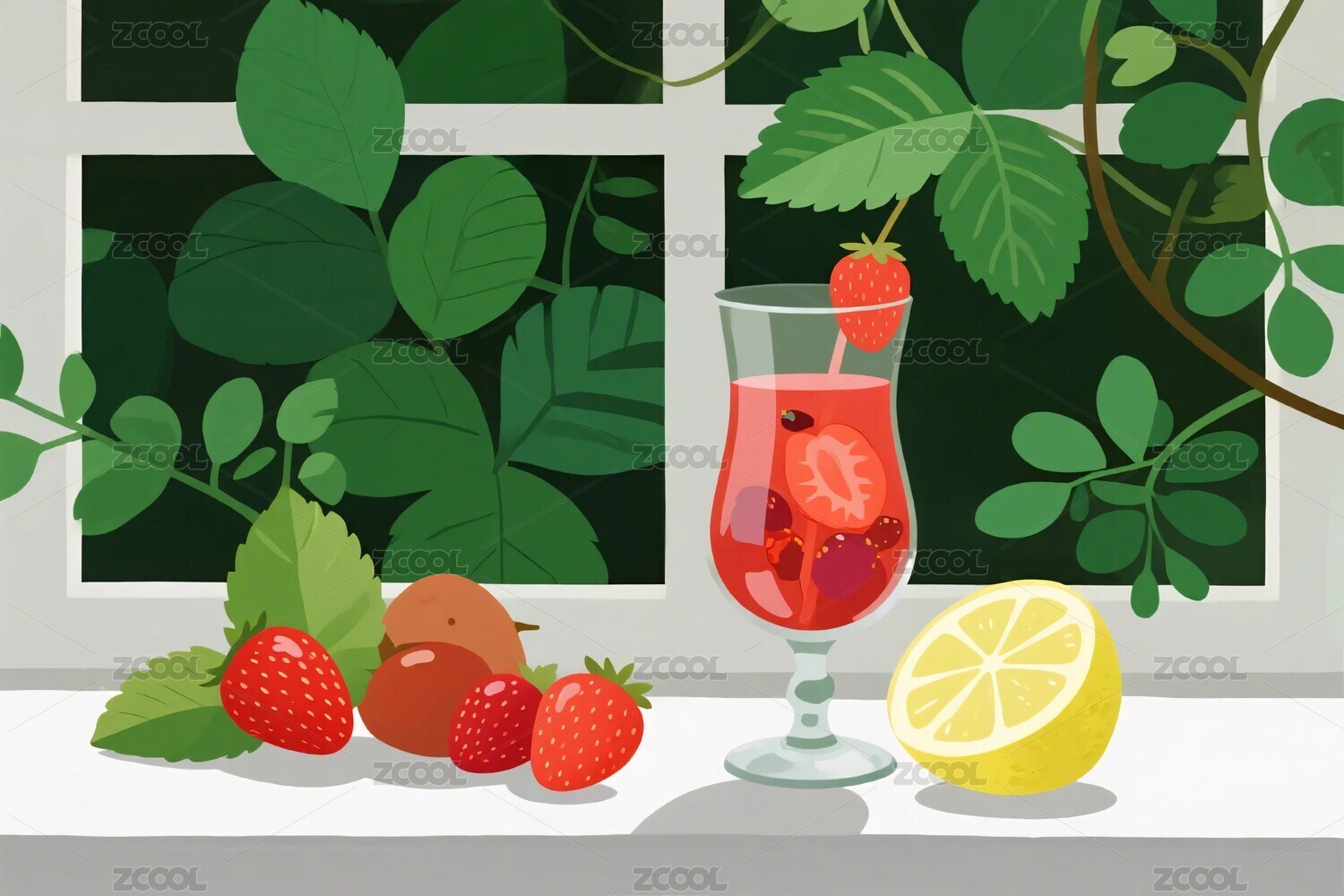 植物盆栽,柠檬,草莓,鸡尾酒,果汁,桌面,插画,装饰,清新,装饰画