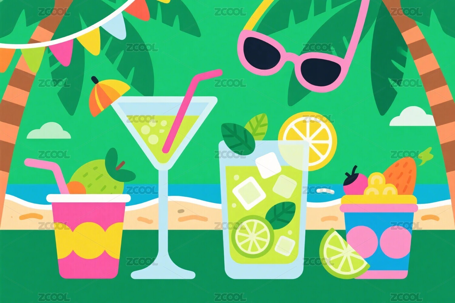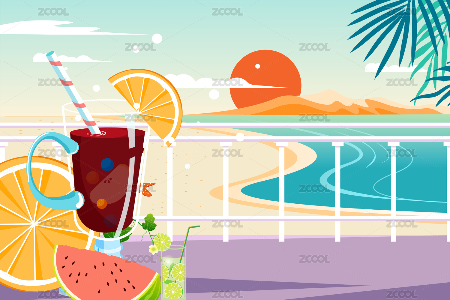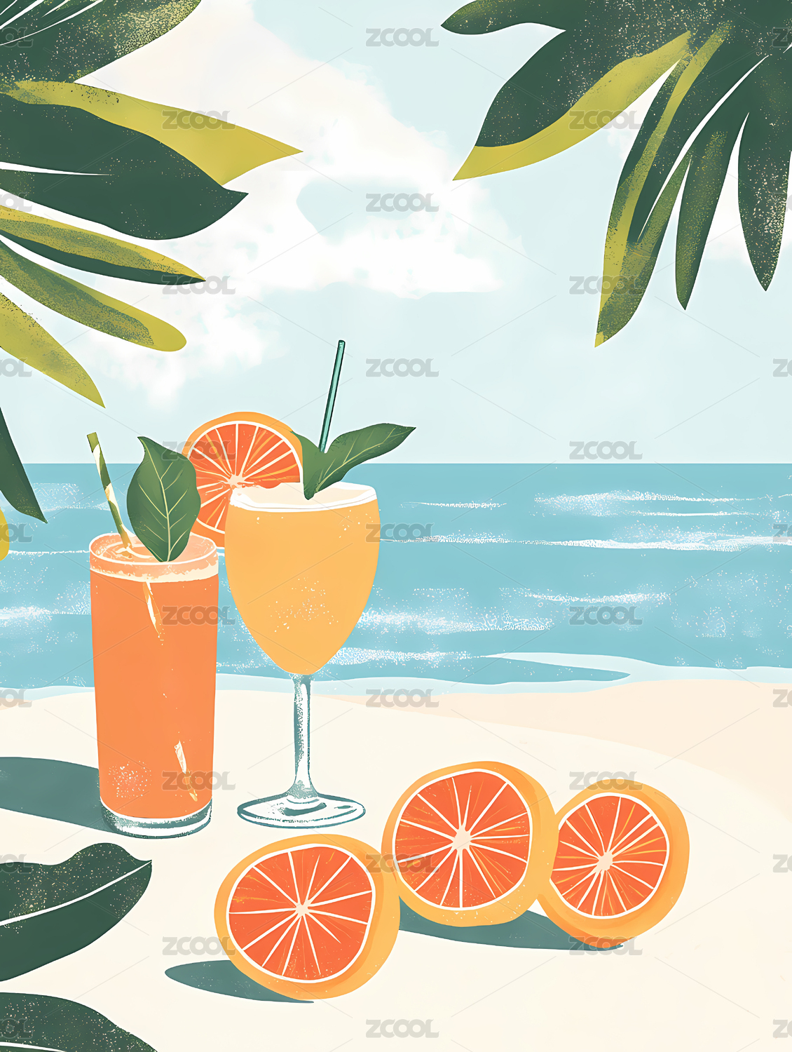热带海滩饮品插画