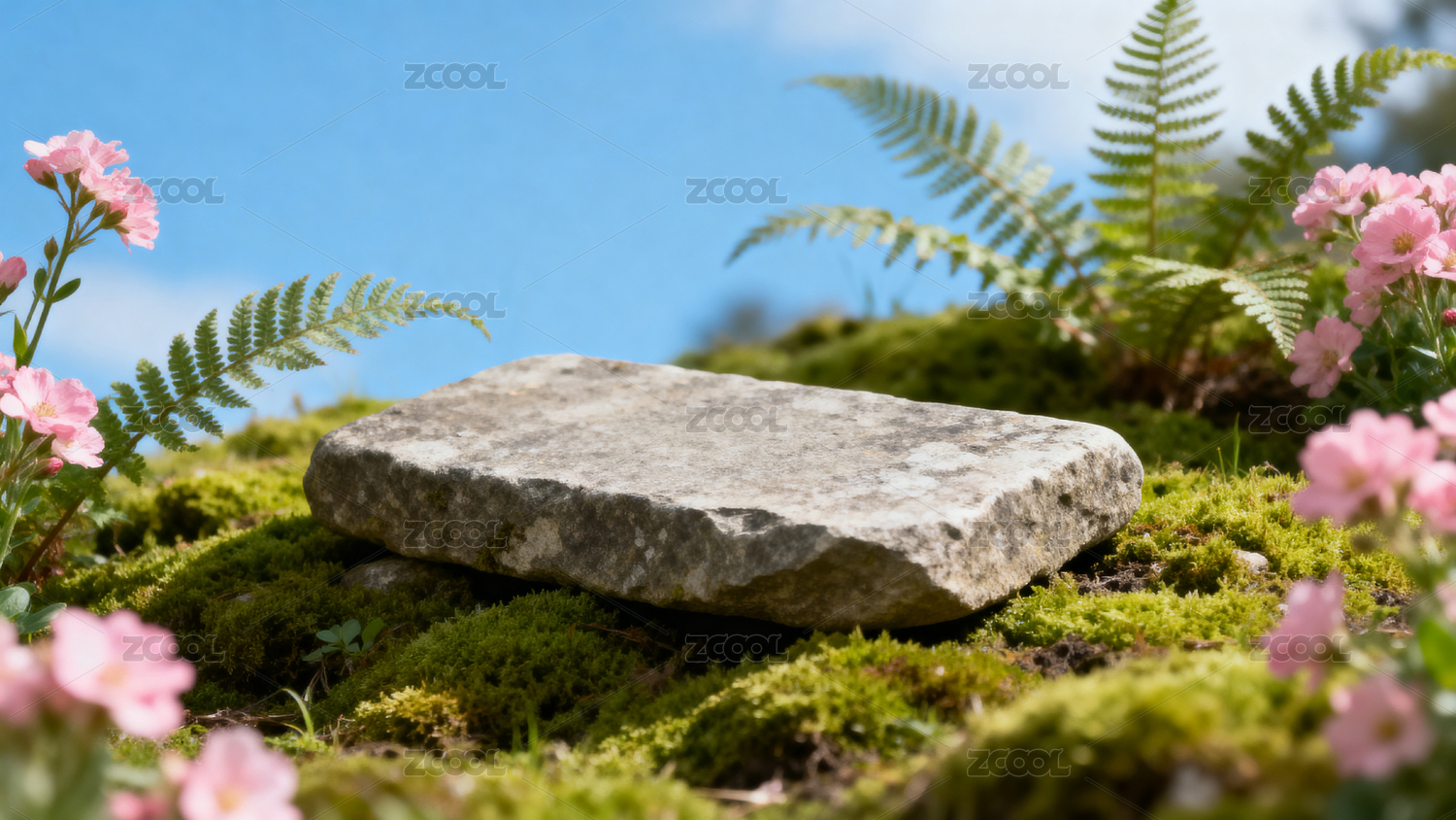 石块苔藓花朵蓝天