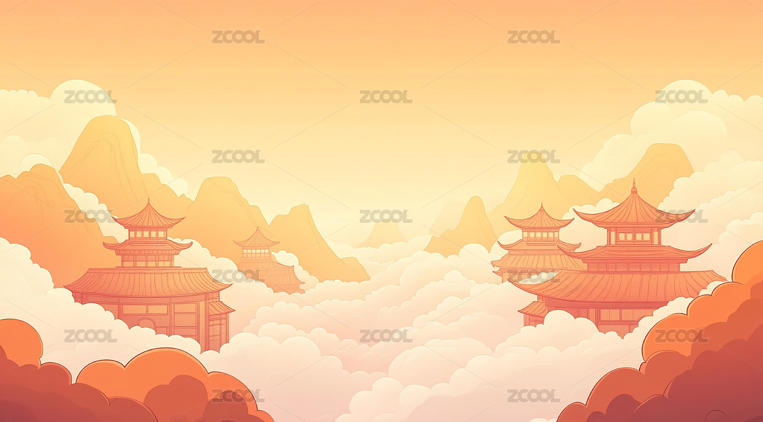 低饱和橘黄色山水古建筑插画背景