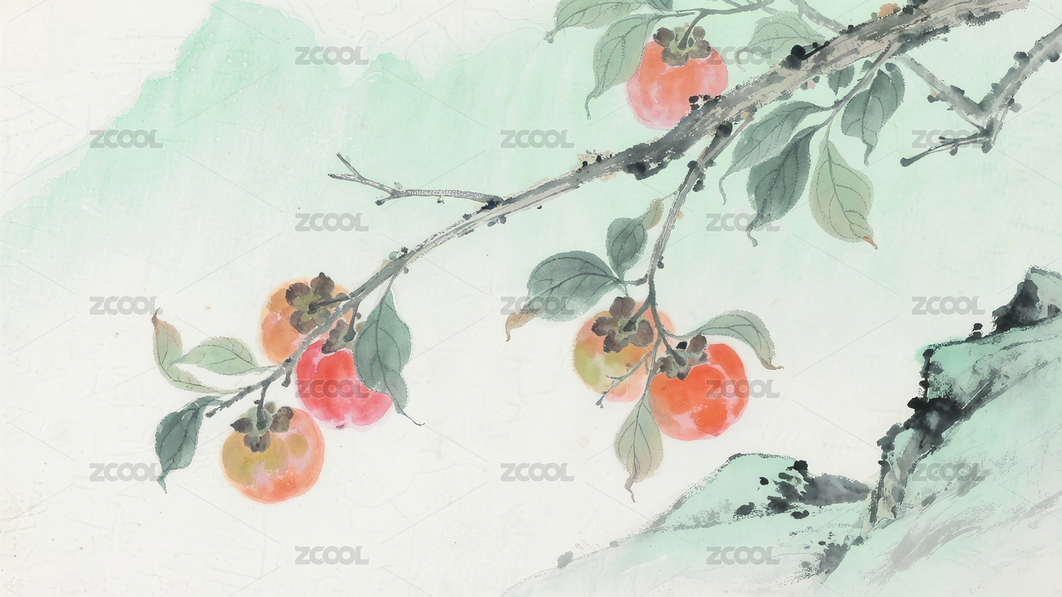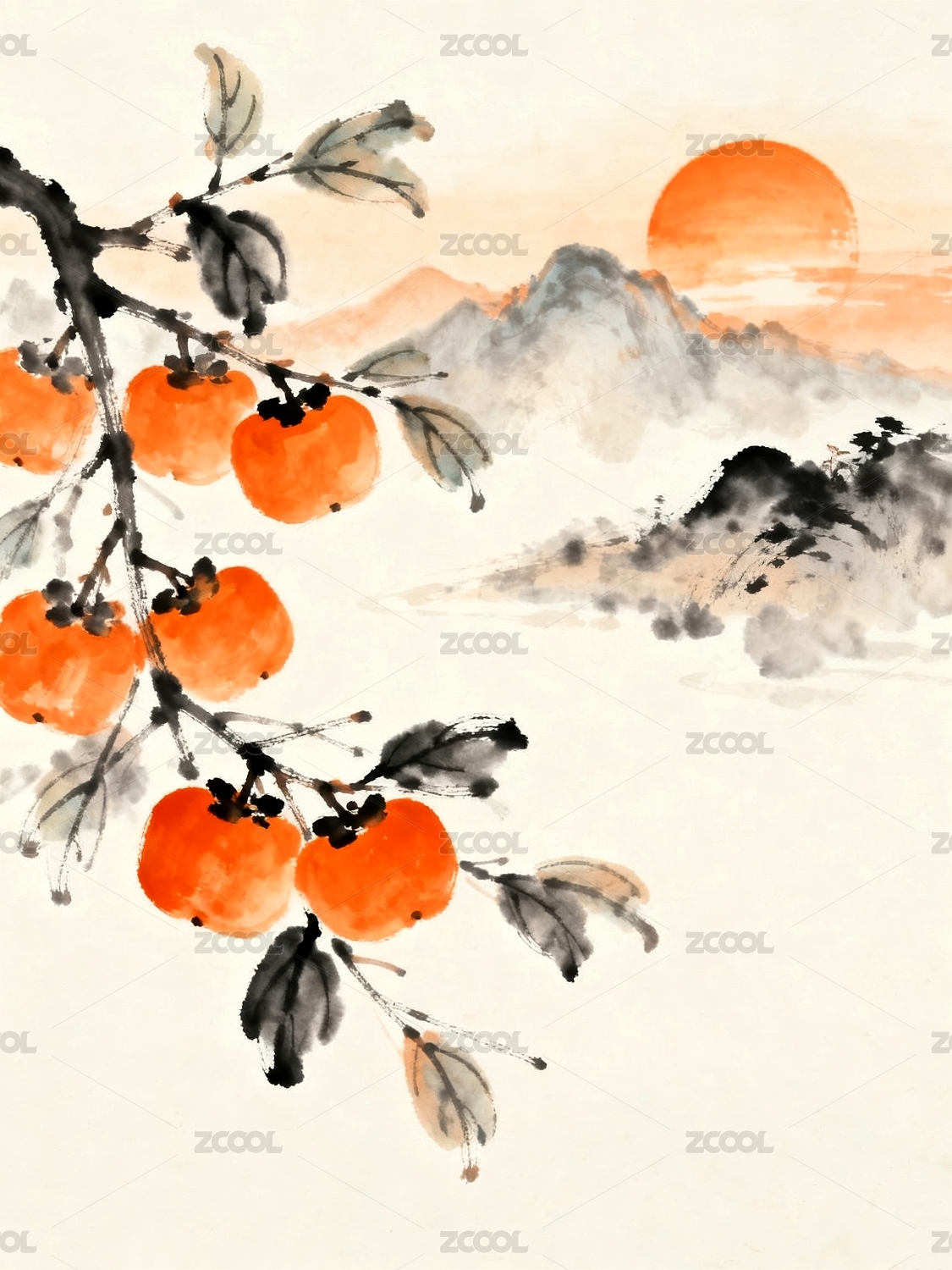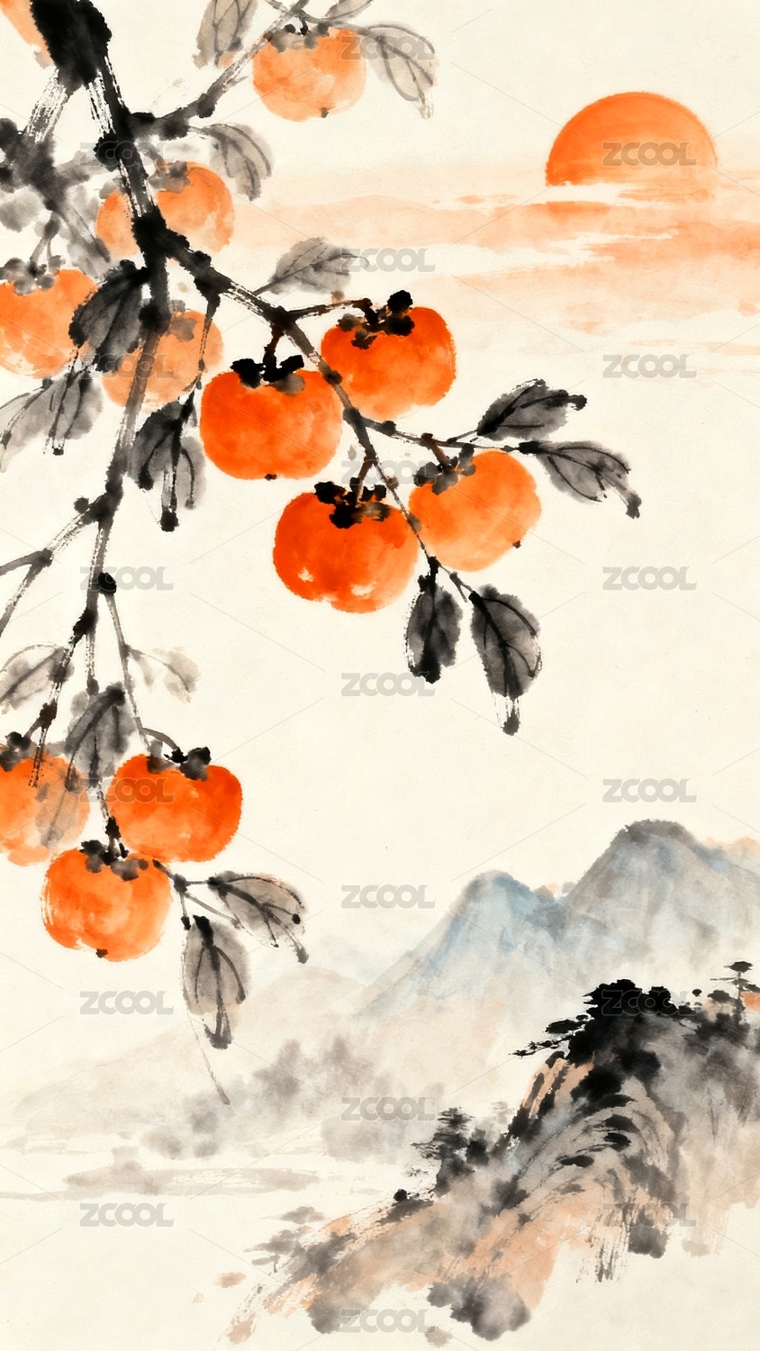 水墨,山水,太阳,柿子,树木,云朵,国画,绘画,艺术,传统