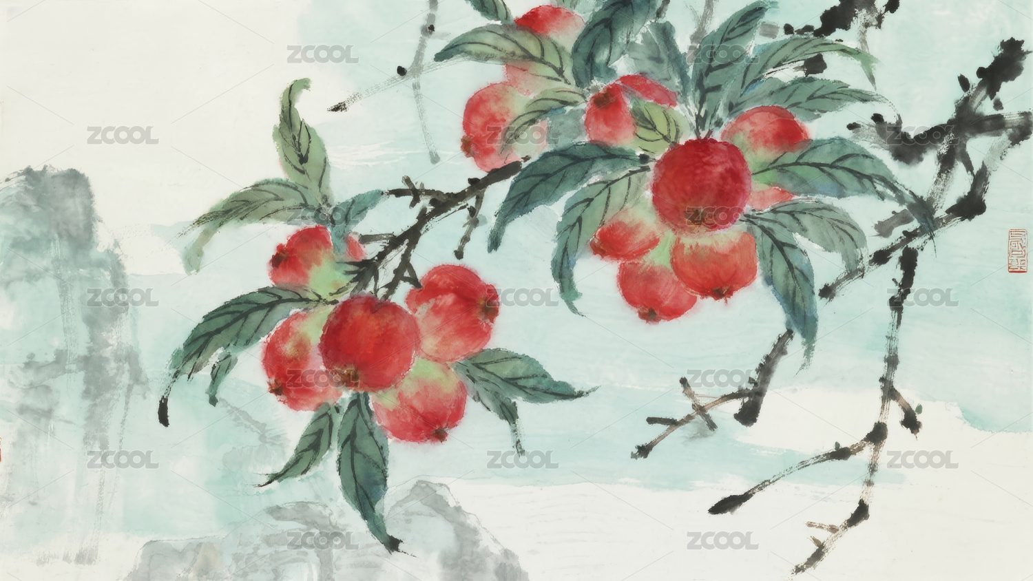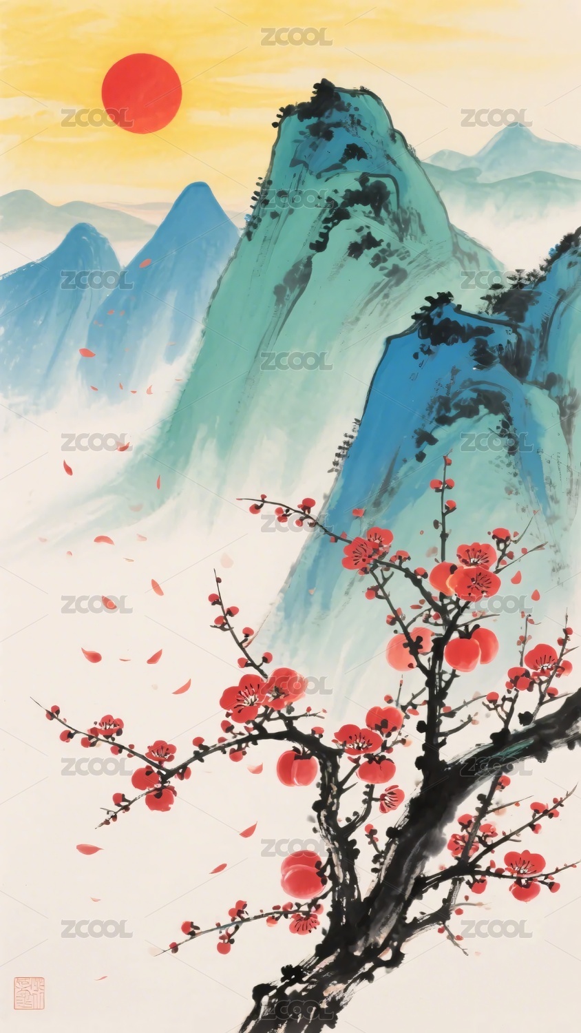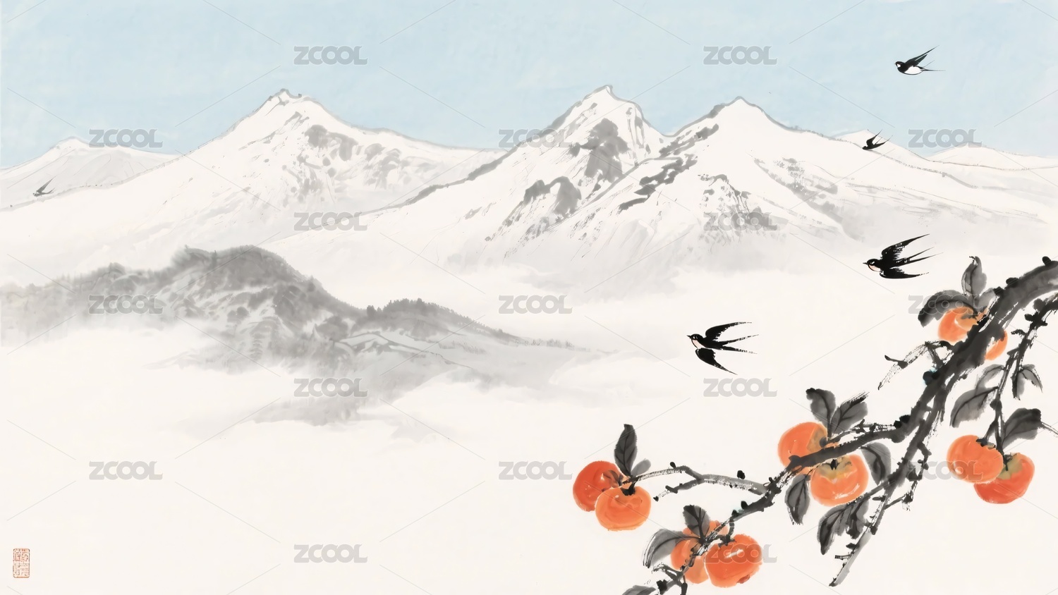 水墨,山水,太阳,柿子,树木,云朵,国画,绘画,艺术,传统