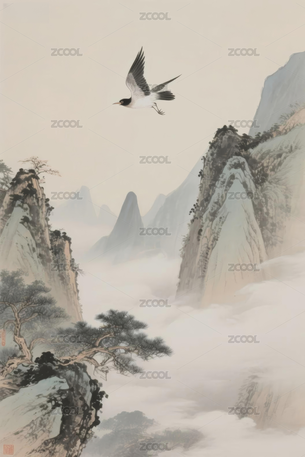 山水画中的飞鸟与云雾