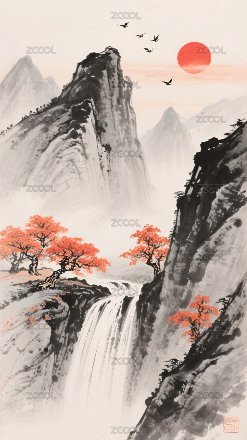 水墨山水间的红日飞鸟景