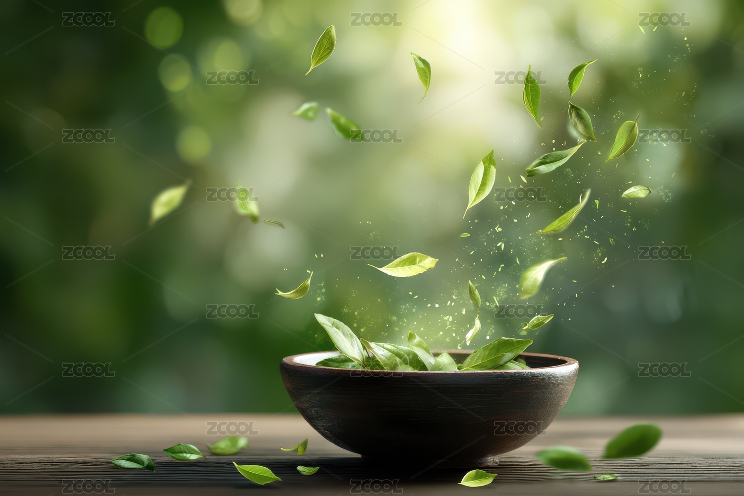 茶叶在玻璃碗中飘散的瞬间捕捉