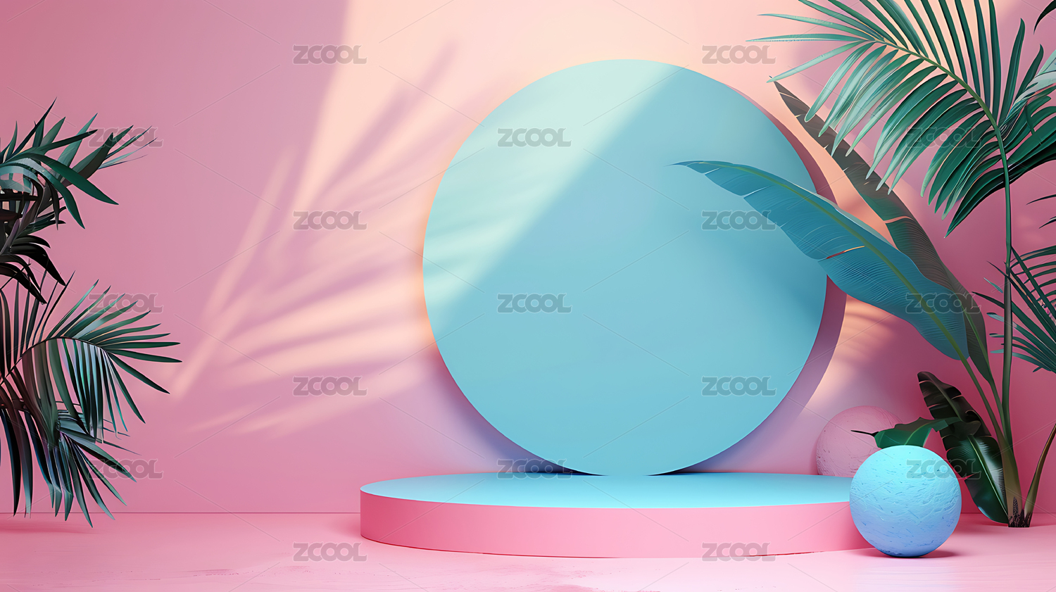 粉色圆形台面与棕榈叶影