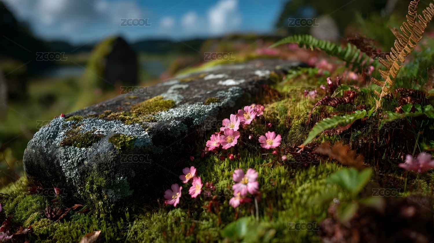 石块苔藓蕨类与粉色花朵