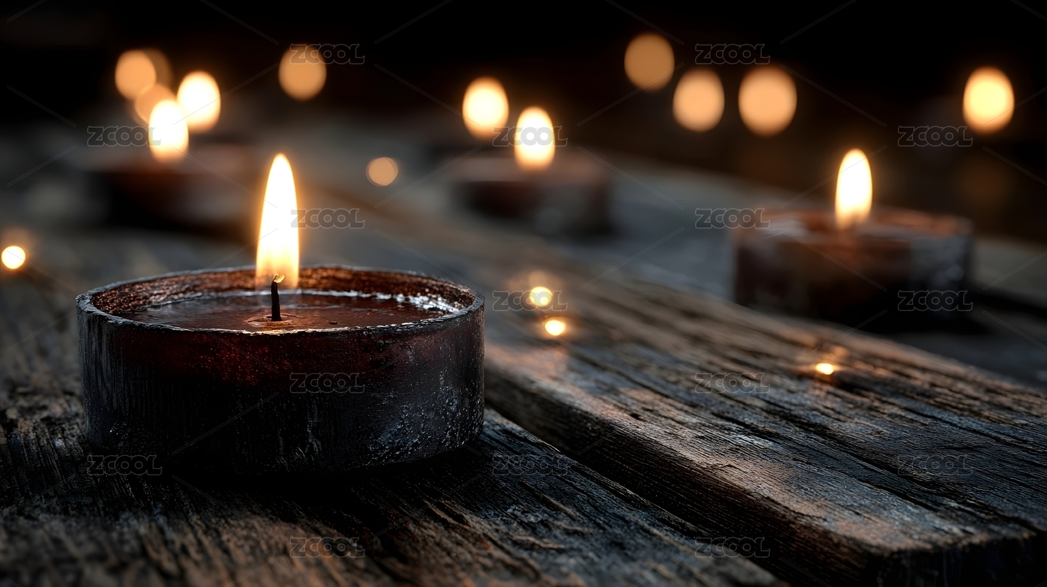 温暖的烛光在木质桌面上
