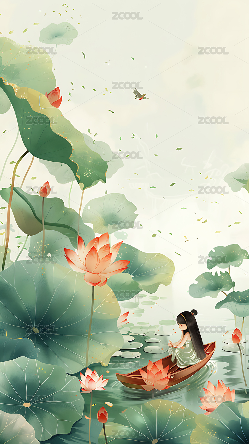 夏天立夏一个小孩在荷花池中划船唯美插画