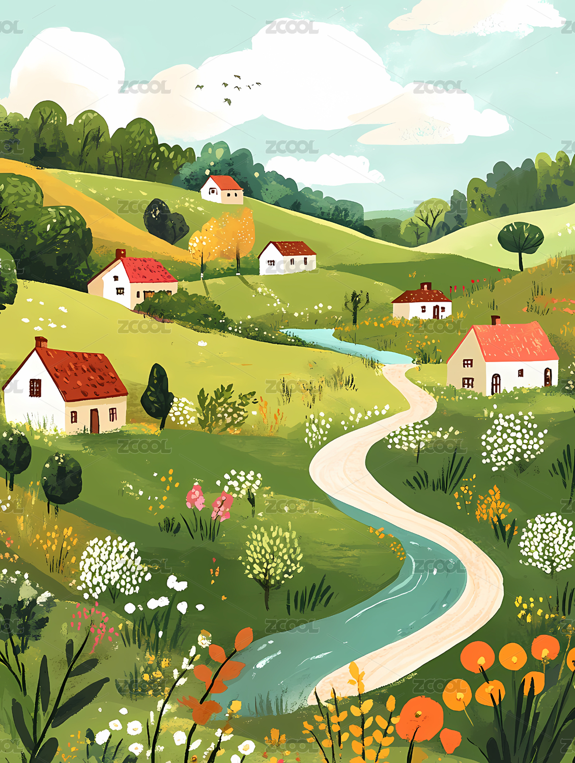 开满花朵的田园风光插画