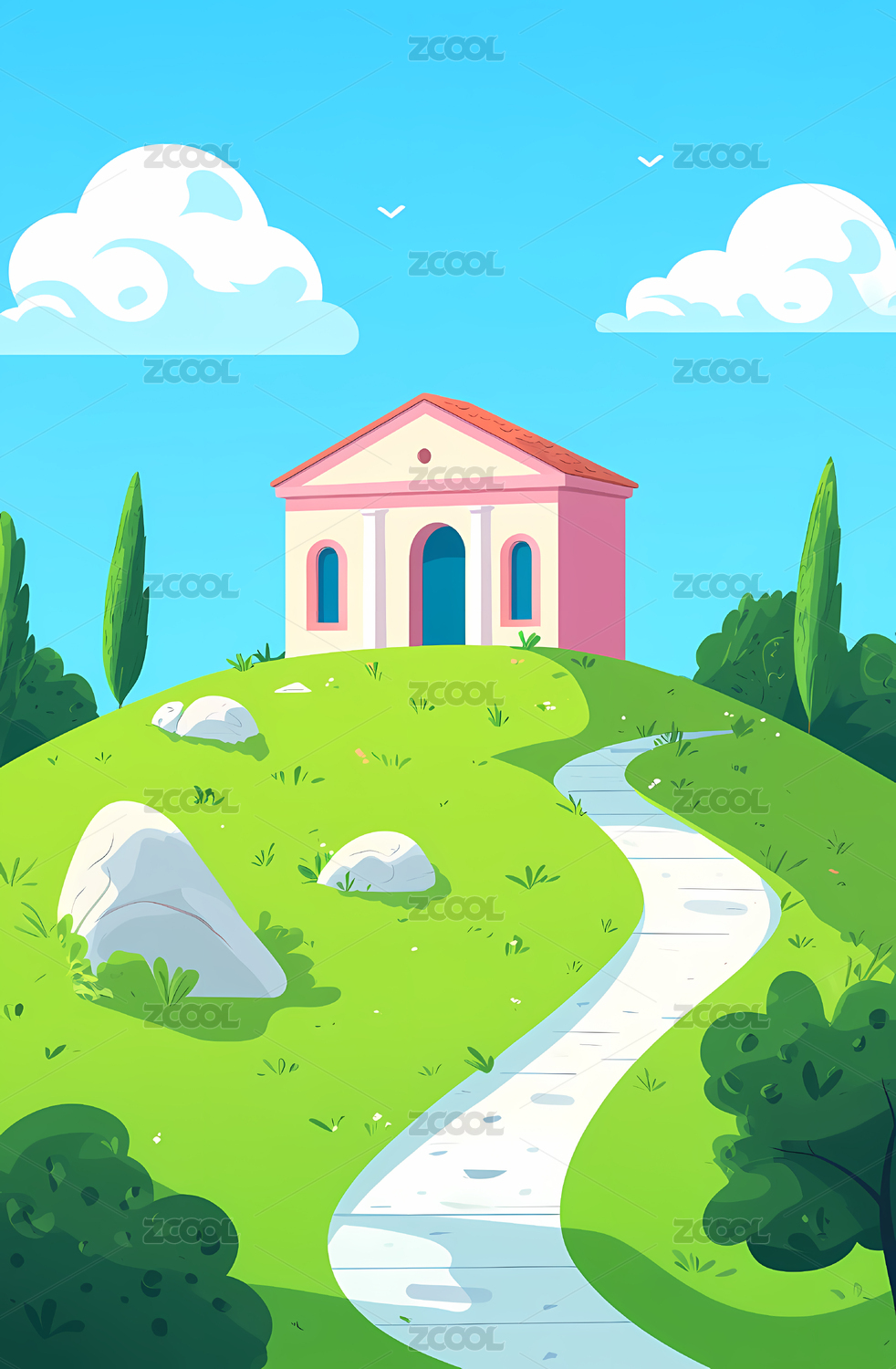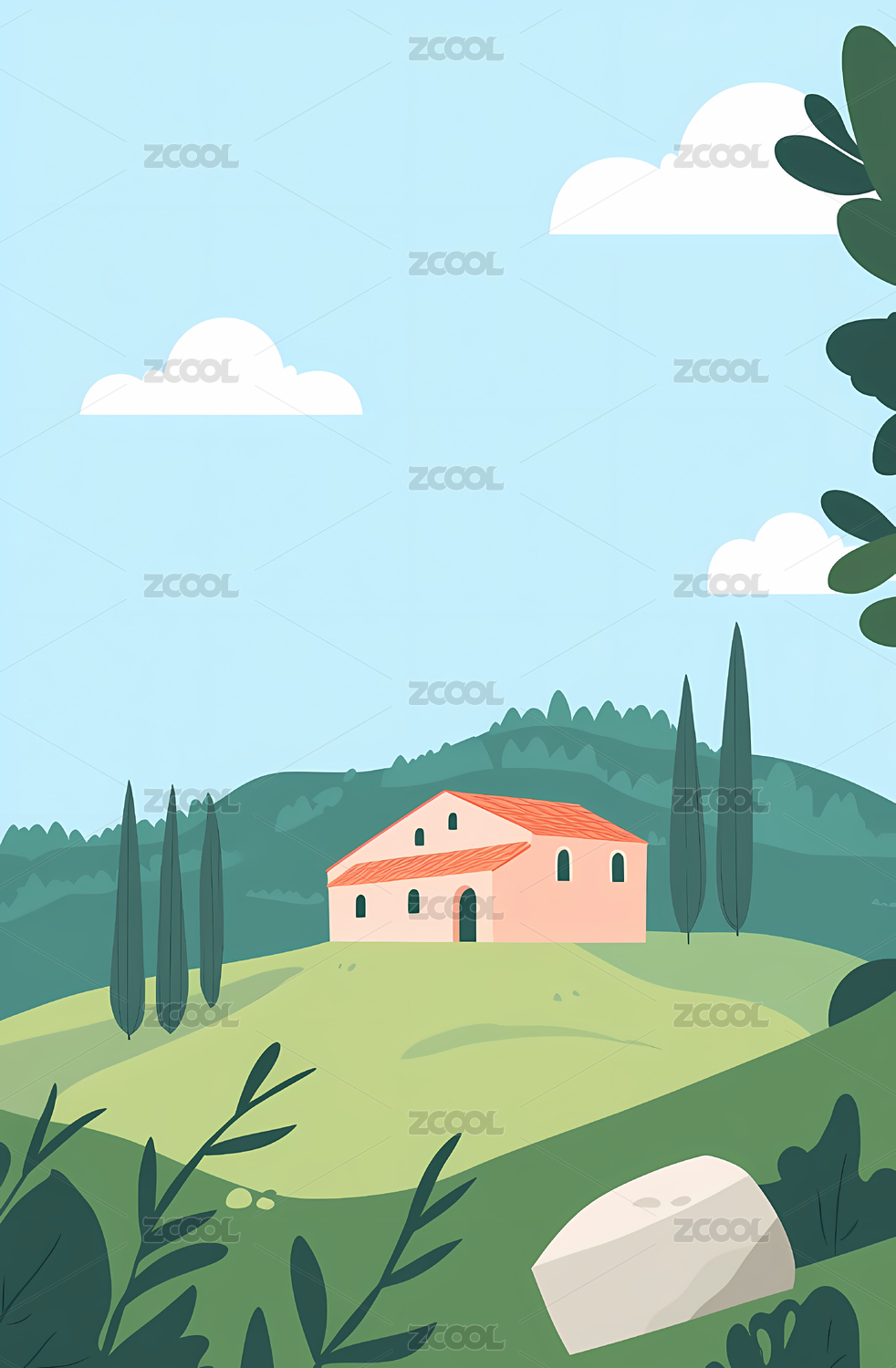 夏天户外旅行山峰房屋乡村风景蓝天白云插画
