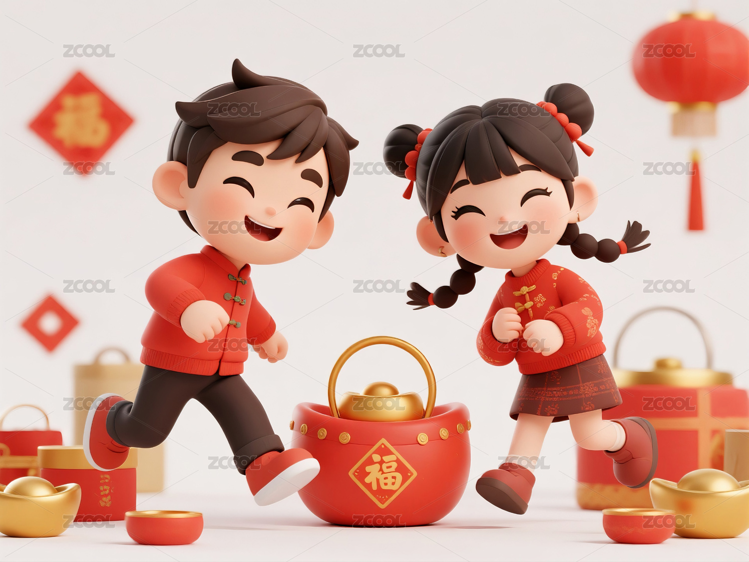 男孩,女孩,三维,3D,可爱,卡通,人物,元宵节,元宵
