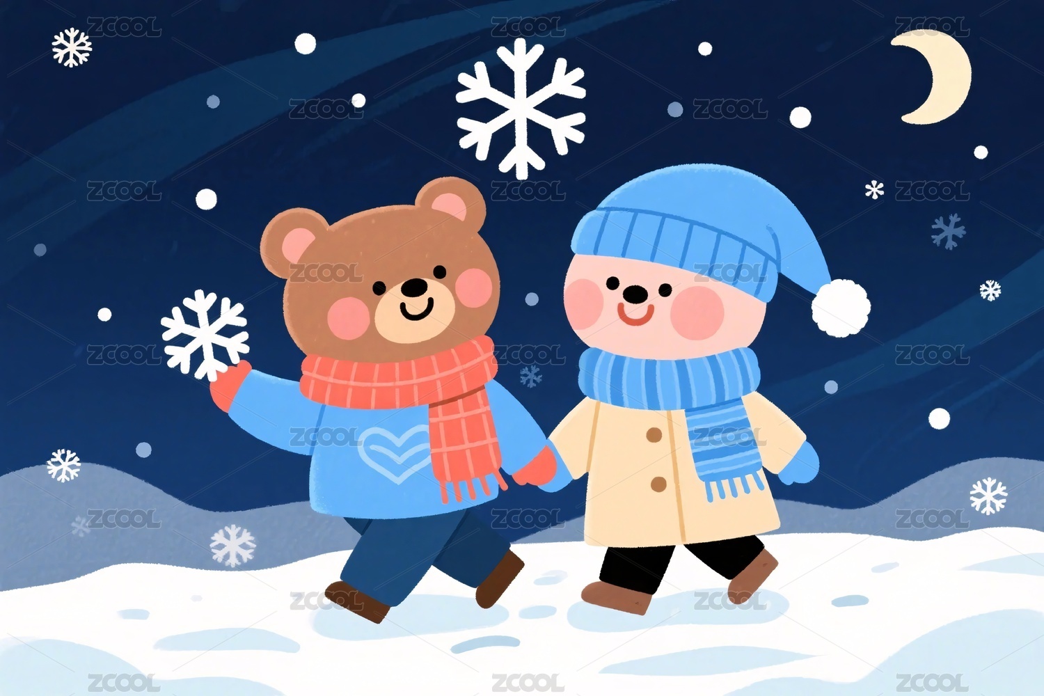 卡通,插画,冬日,雪景,小孩,牵手,雪花,帽子,围巾,雪地