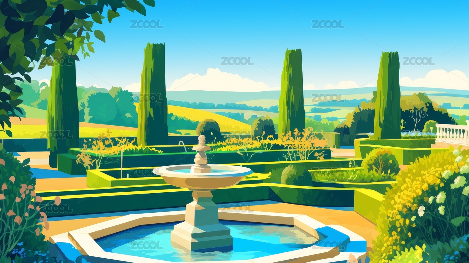 花园,石拱门,庭院,绿植,树木,房屋,建筑,风景,插画,背景