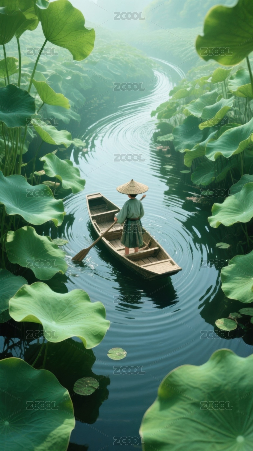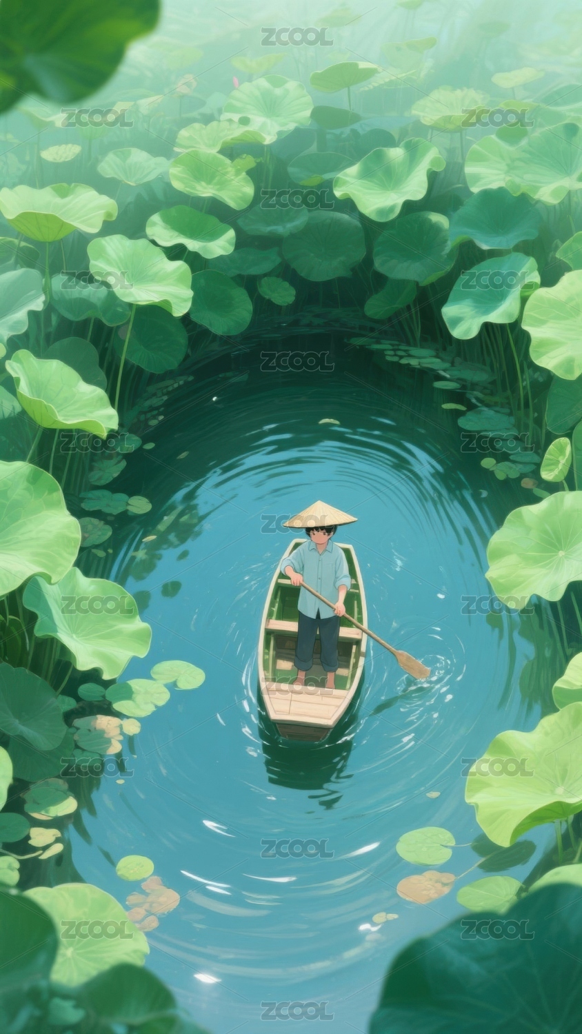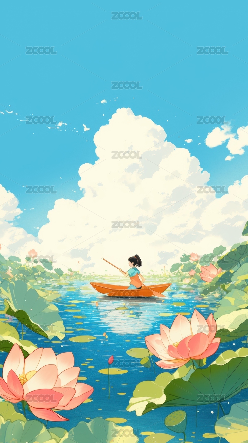 夏天立夏一个小孩在荷花池中划船唯美插画