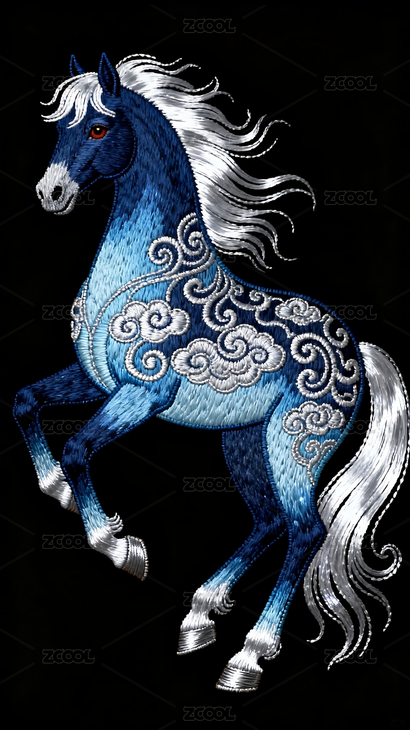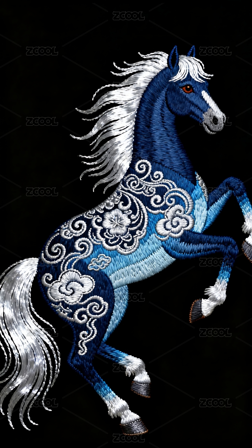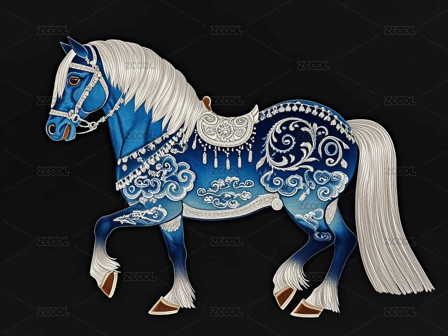 马,蓝色,祥云,图案,白花,站立,纯色背景,优雅,复杂,装饰