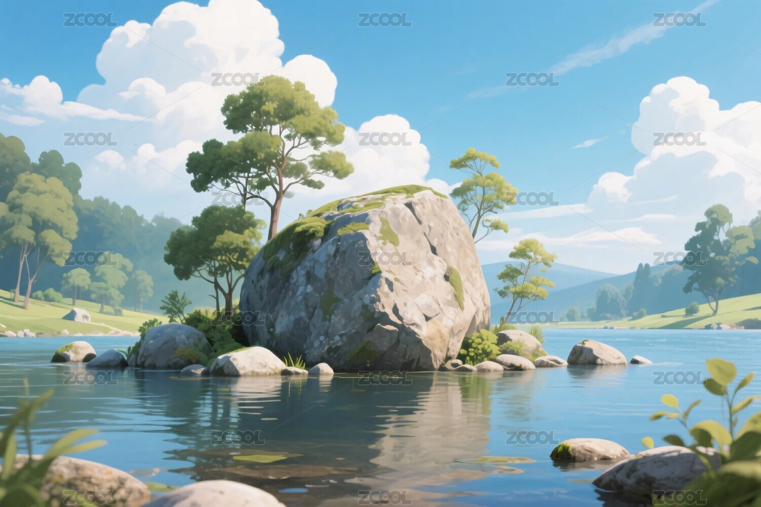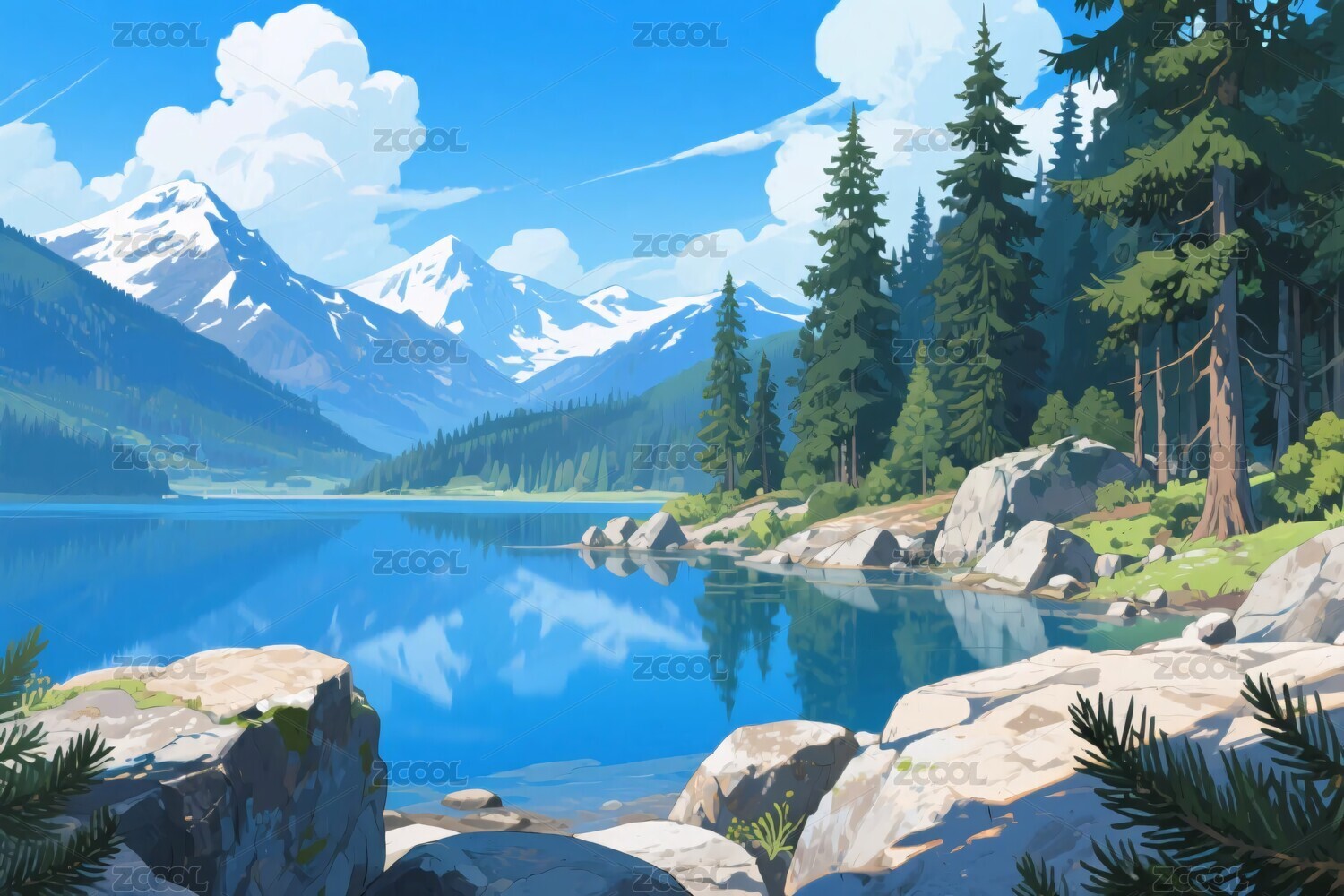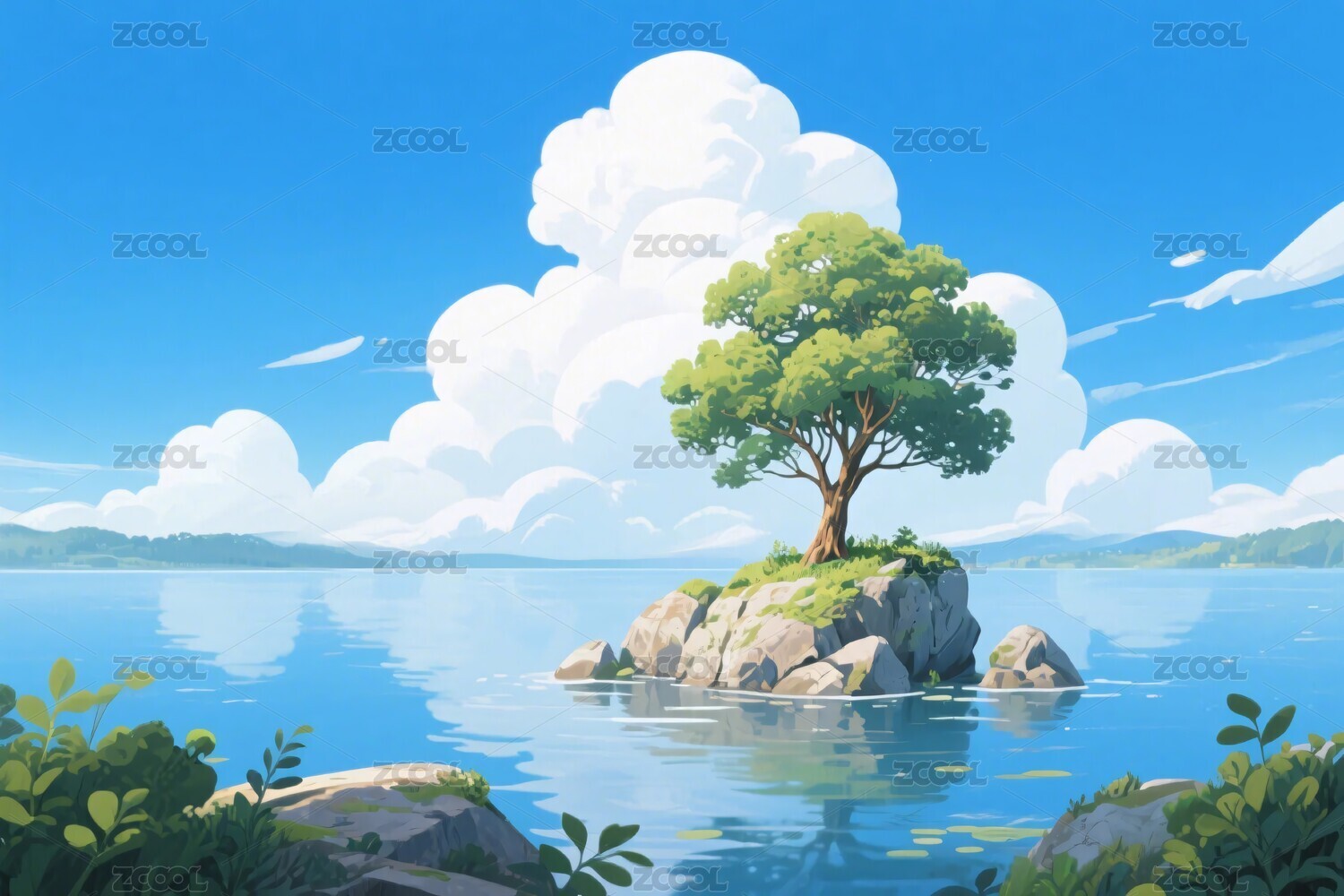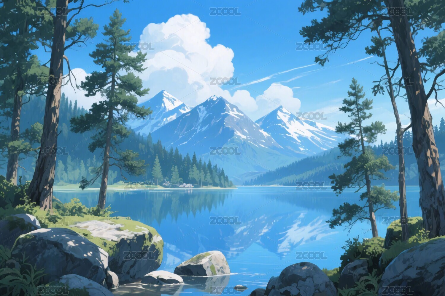 山水,湖泊,树木,天空,白云,风景,插画,自然,画面元素,宁静
