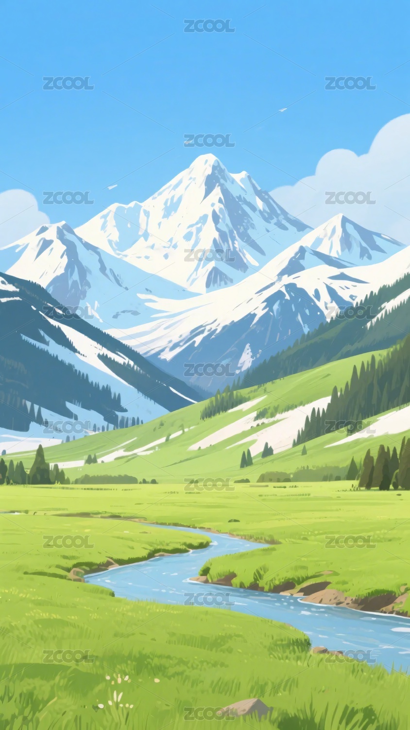 美丽的雪山草地河流风景