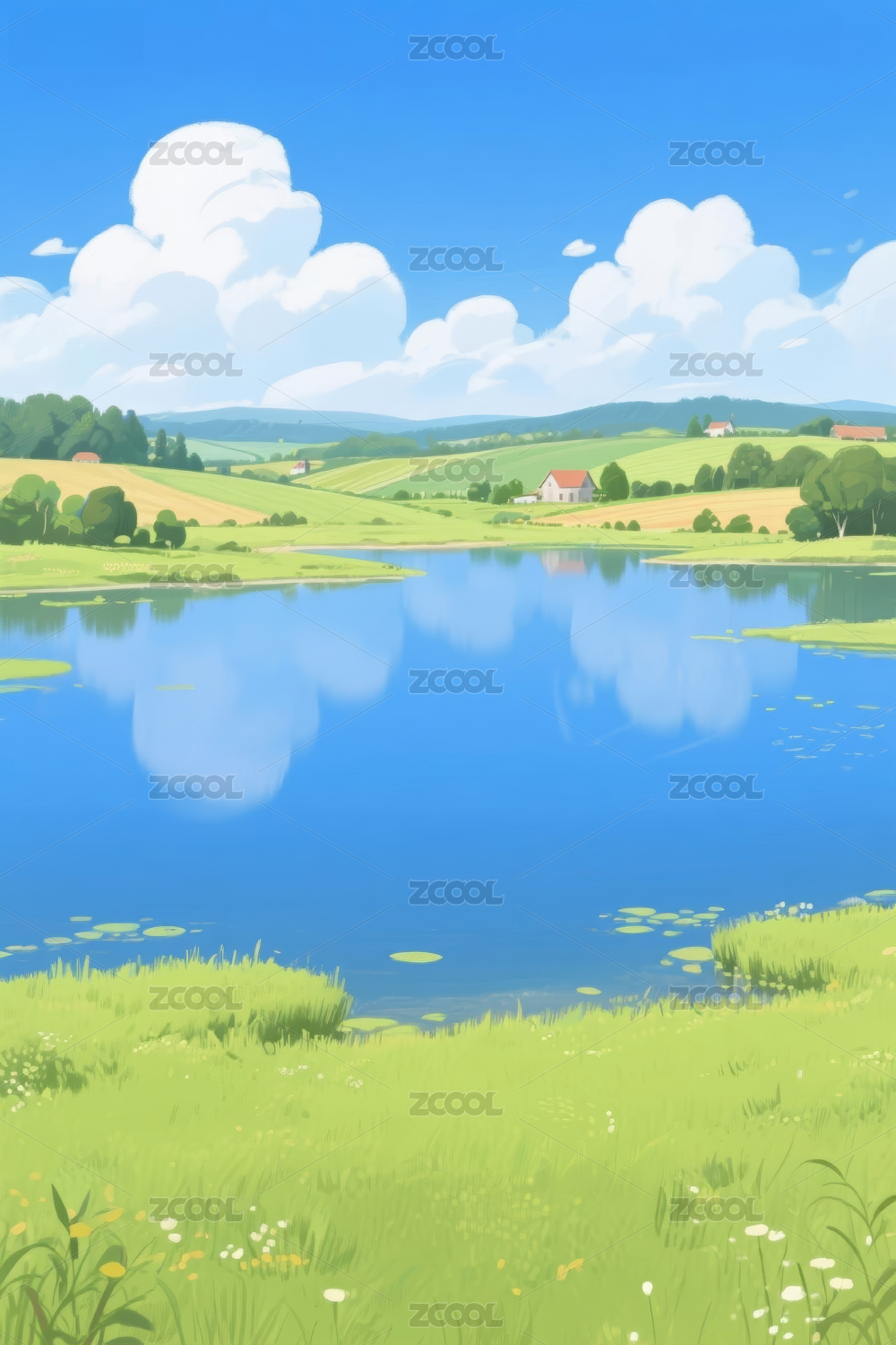 山水,湖泊,草地,树木,白云,蓝天,插画,风景,自然,画面