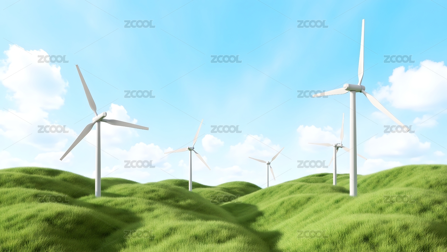 3D绿色的草地上风力发电