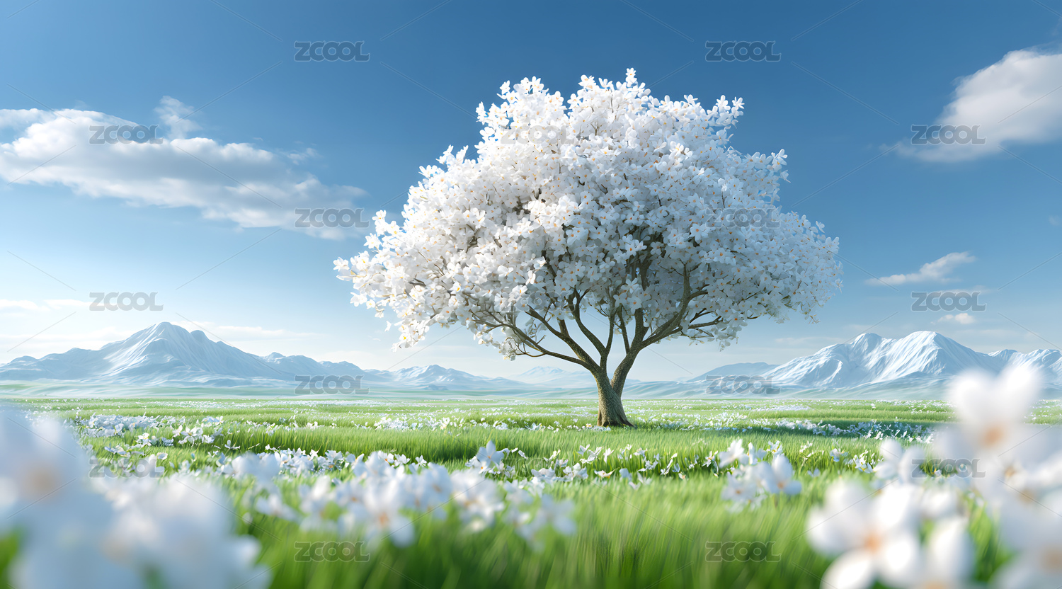 白花,树木,蓝天,白云,草地,春天,自然,风景,插画,背景