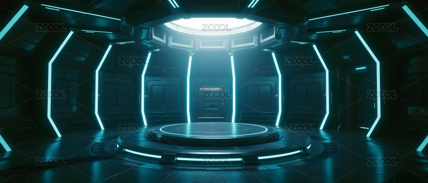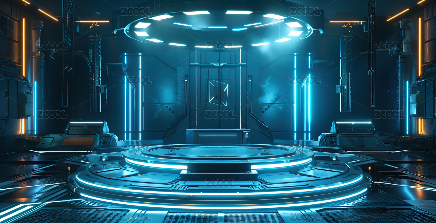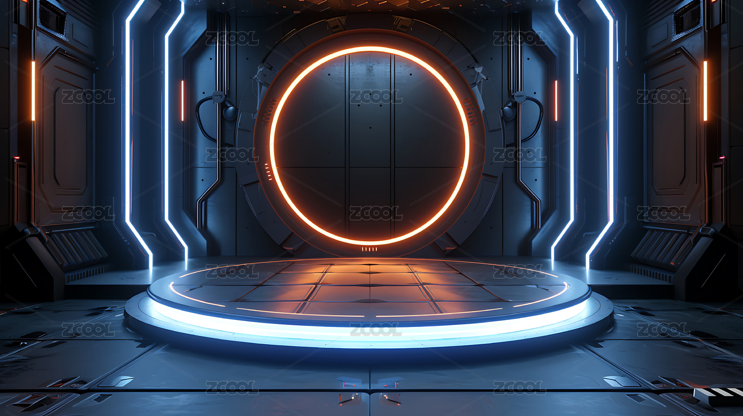 科技,未来,蓝色,橙色,室内,柱子,圆形,灯光,墙壁,天花板