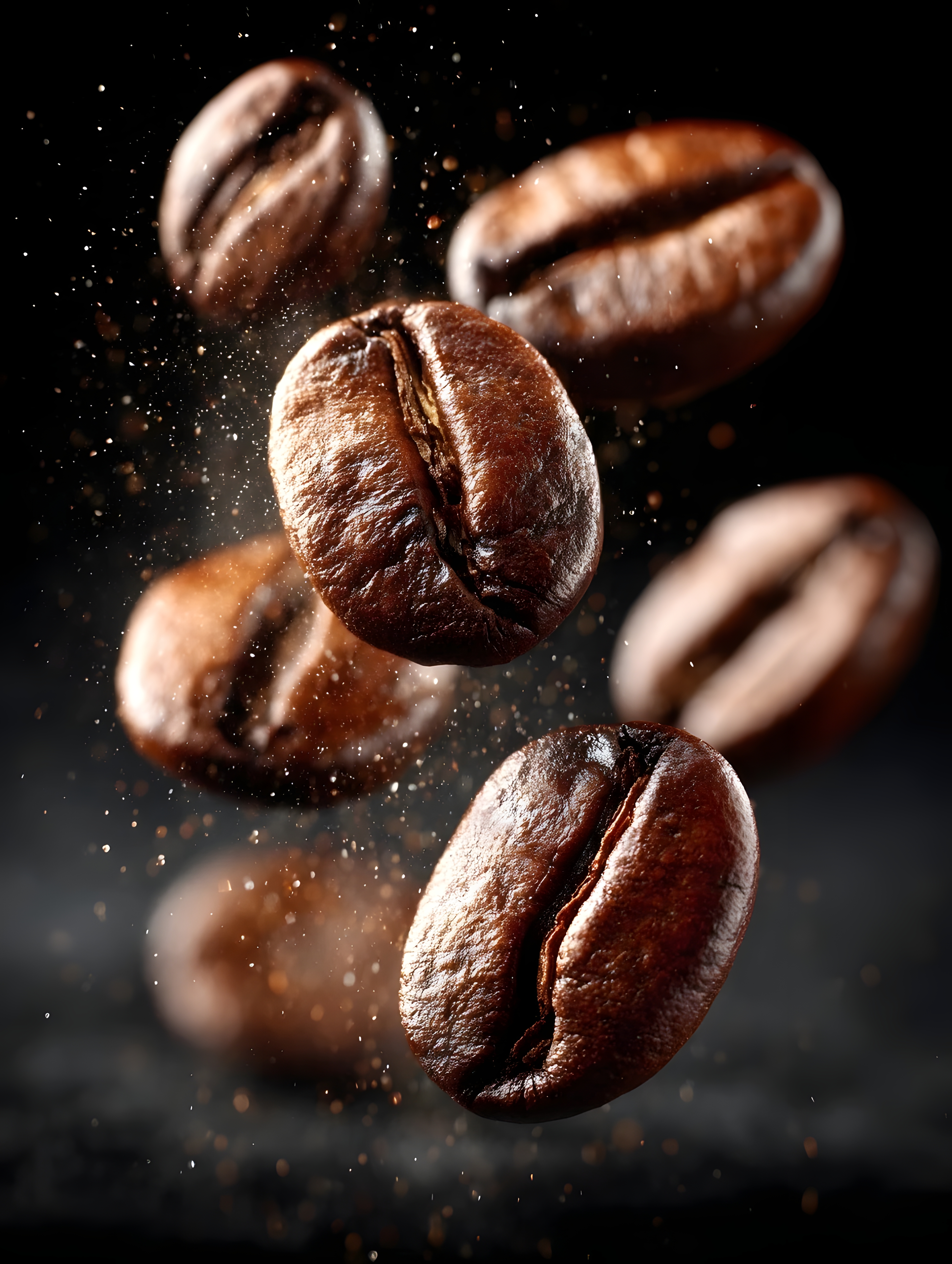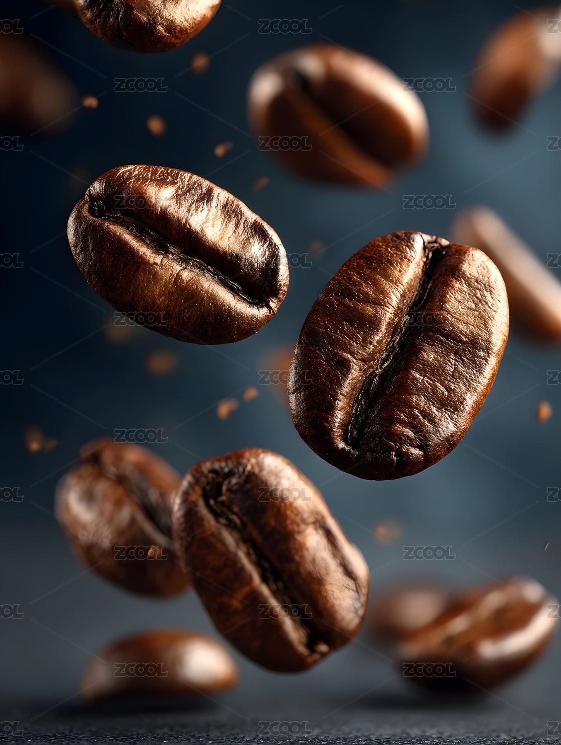 空中悬浮的烘焙咖啡豆